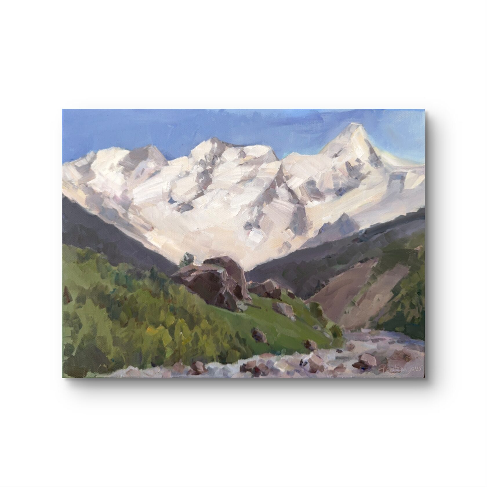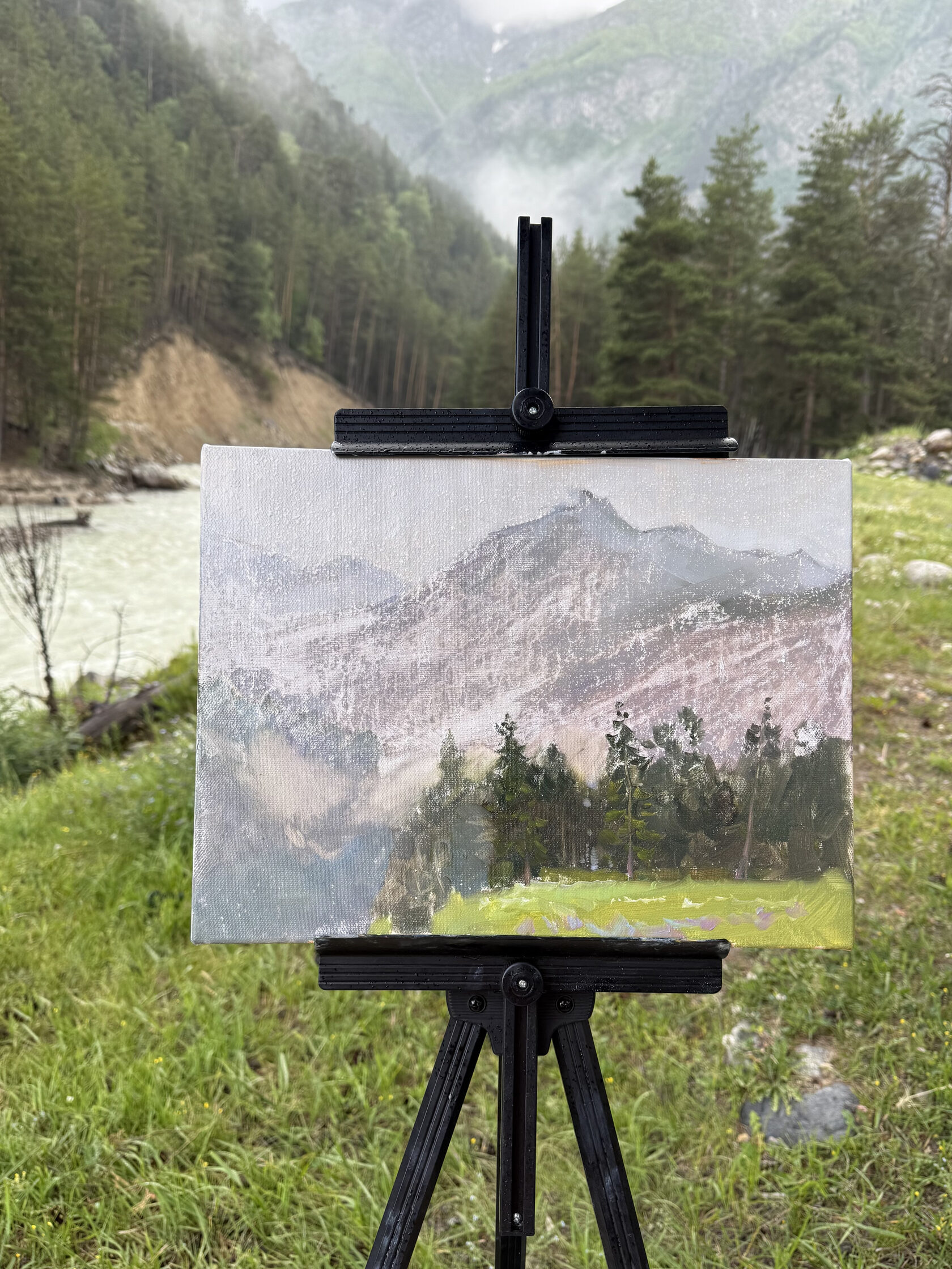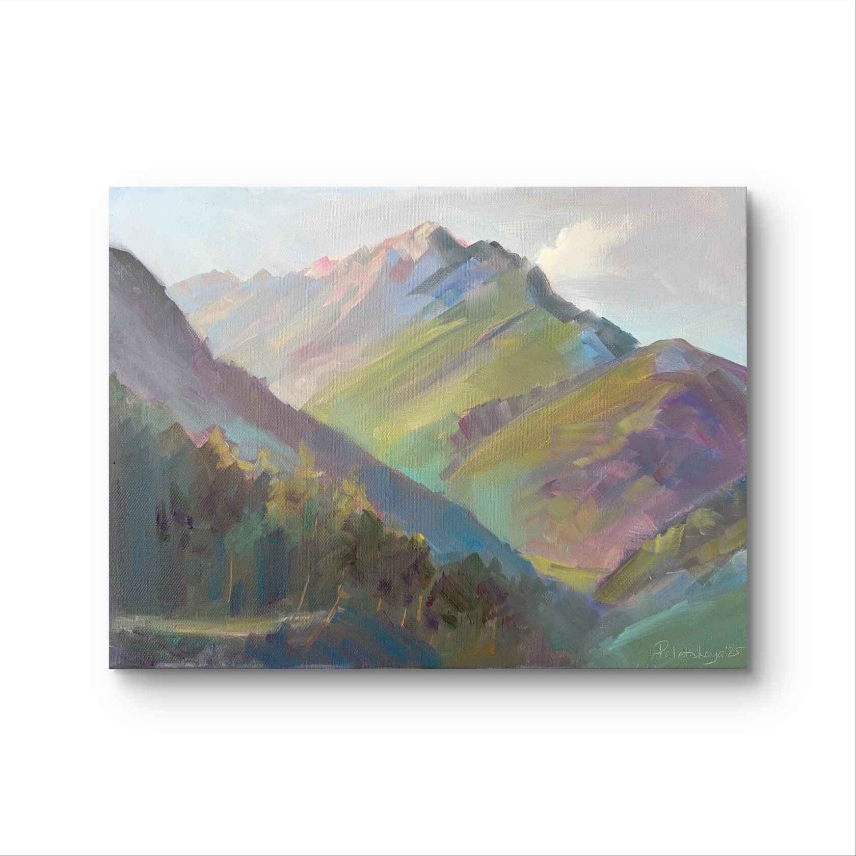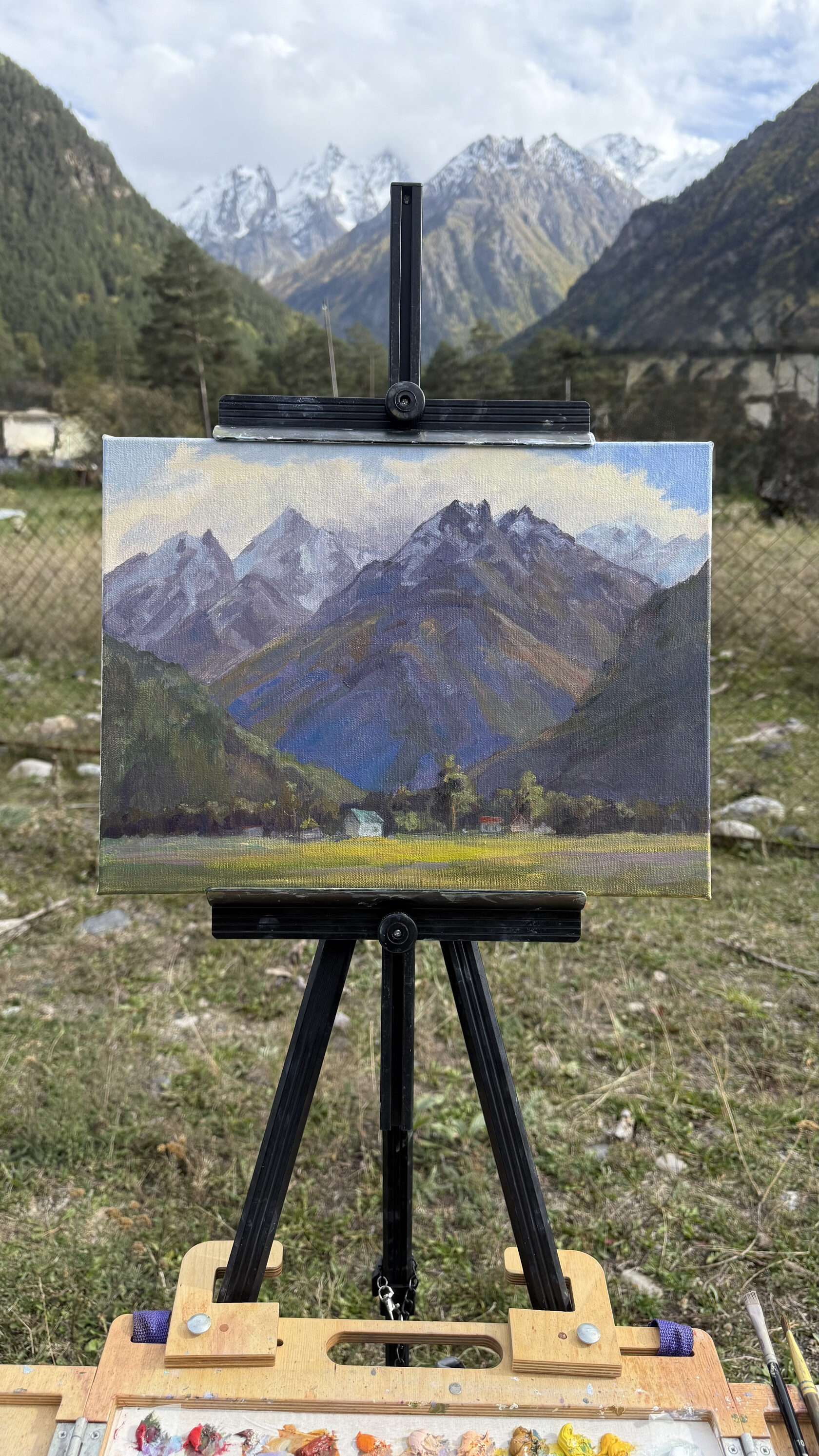 Предзакатное время в Верхнем Баксане, Приэльбрусье. Мягкие, пастельные оттенки. Масляный этюд написанный вживую. Холст на подрамнике, подвесы входят в комплект. Возможно оформление в раму.