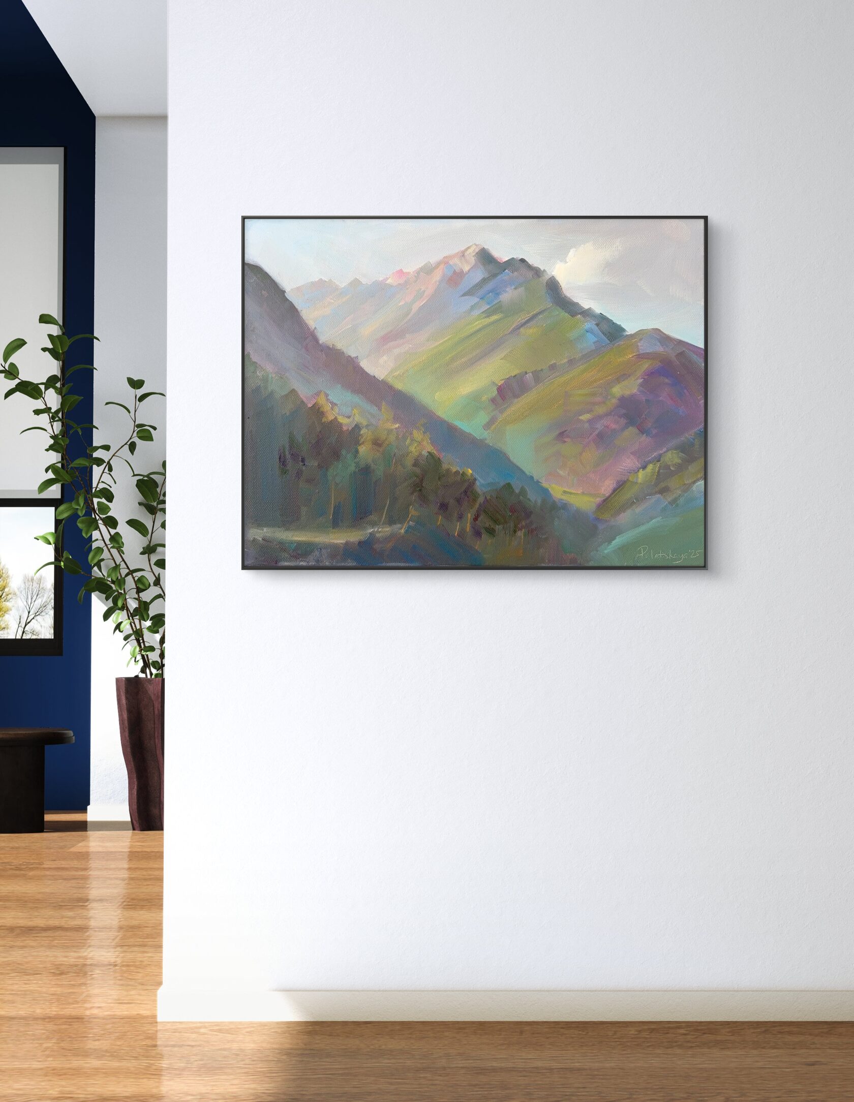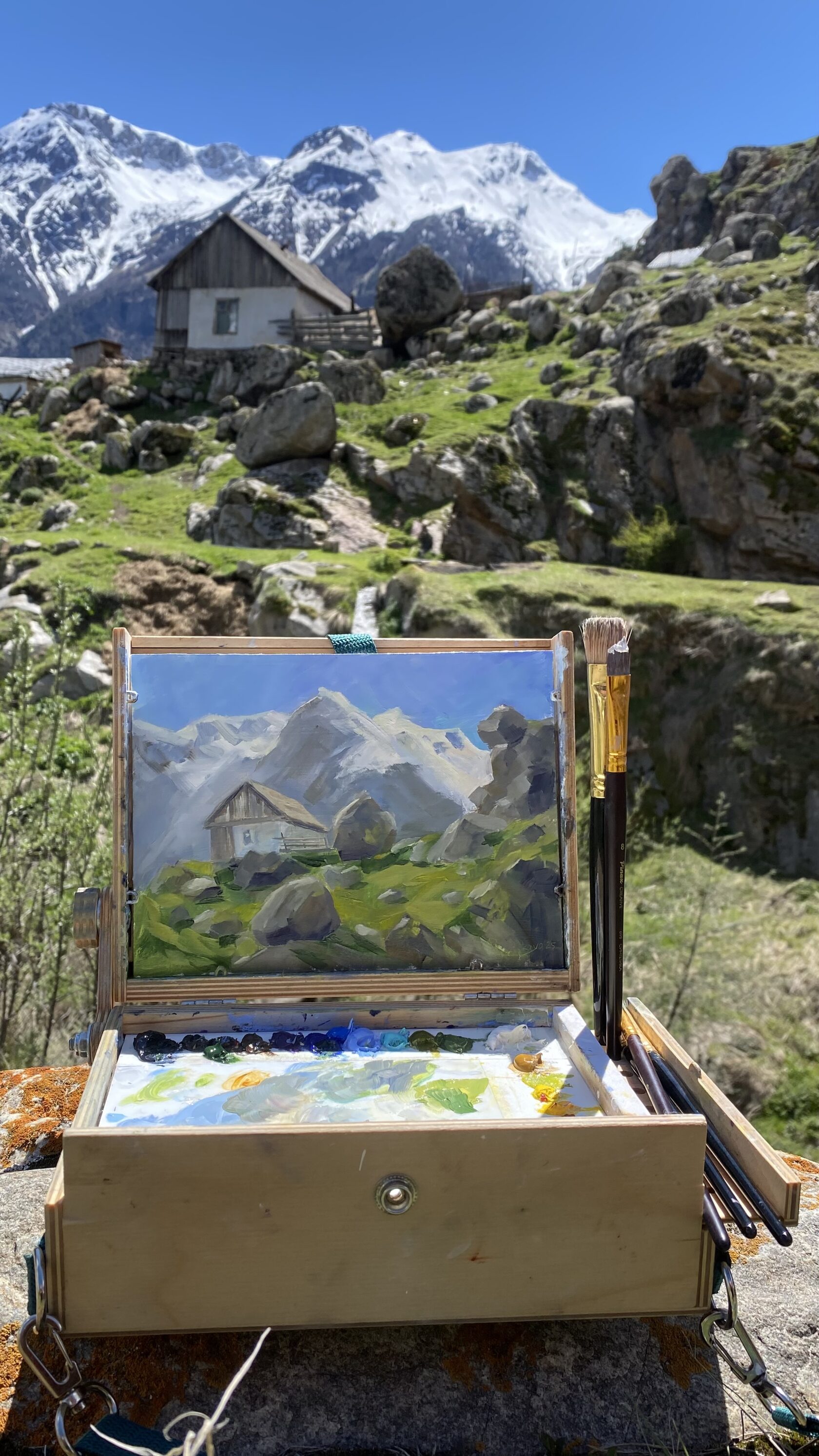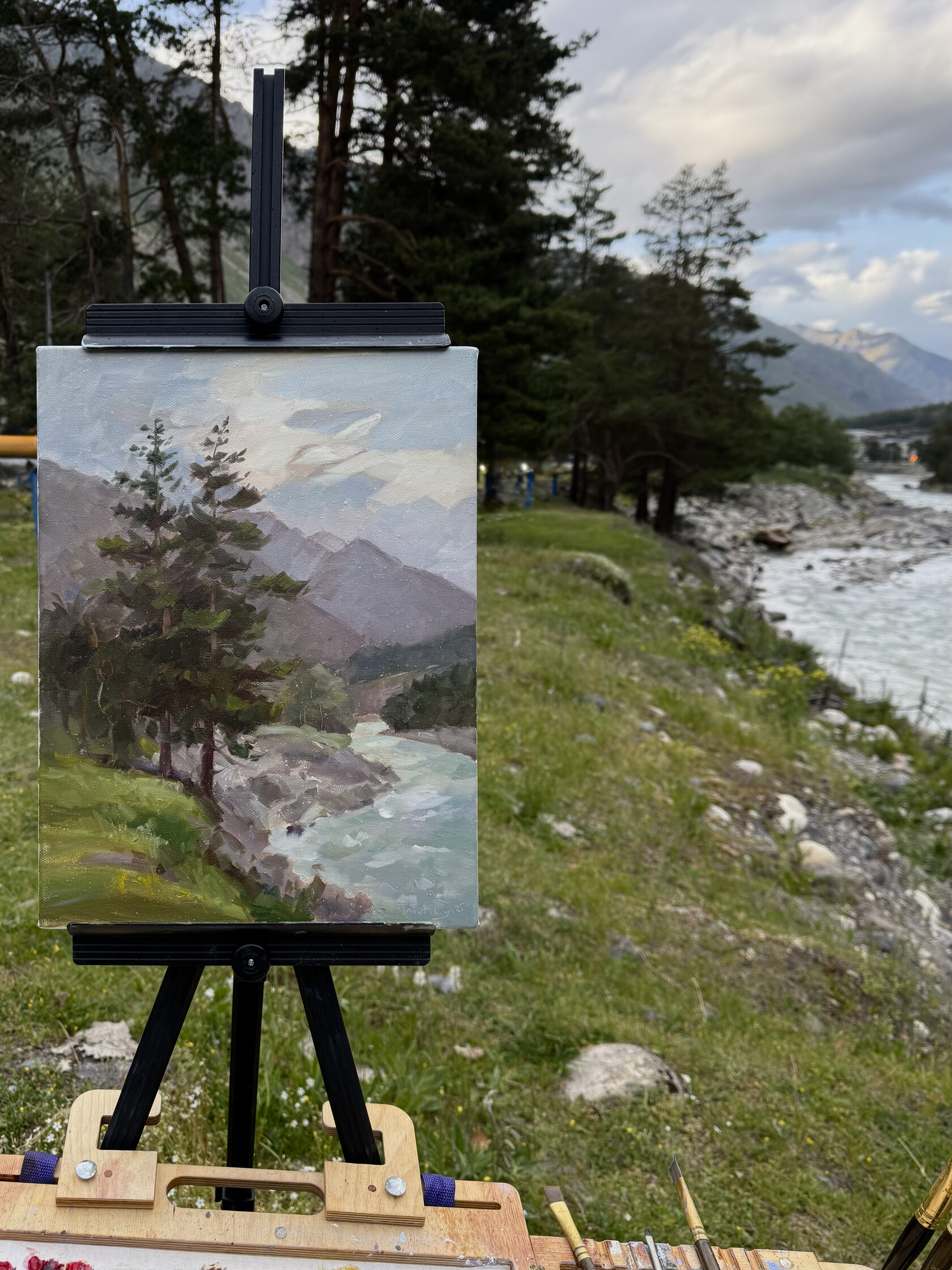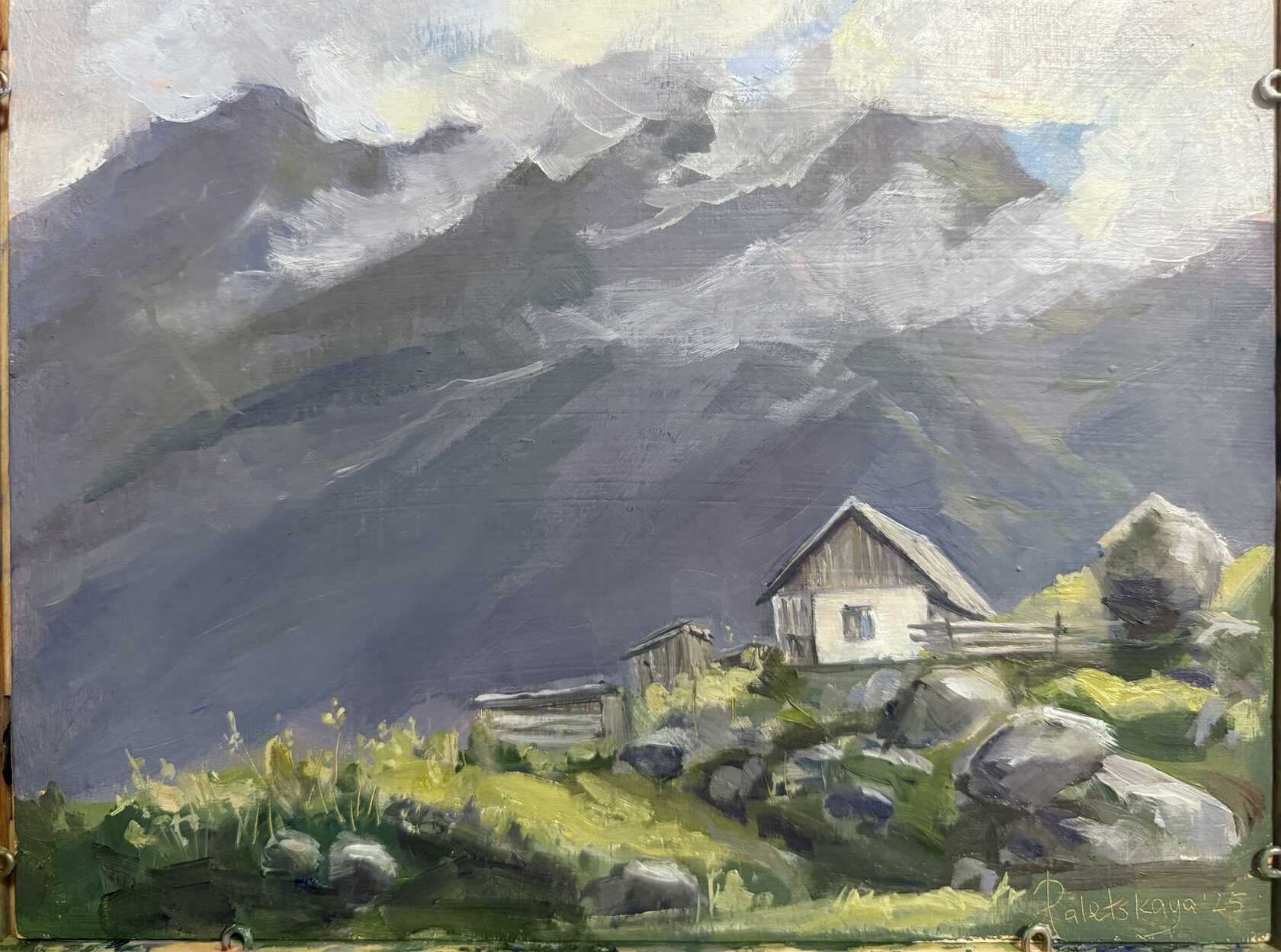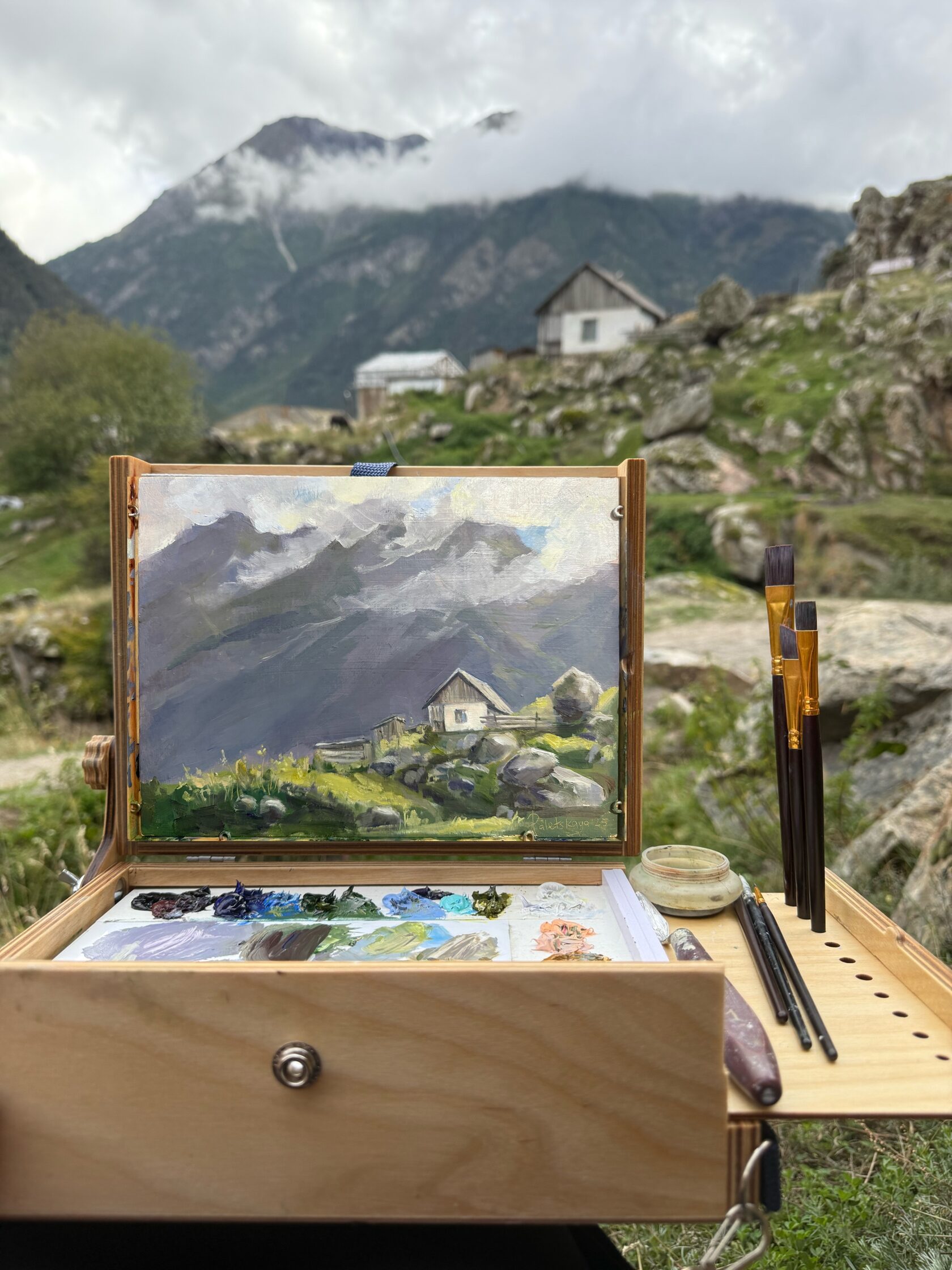 Предзакатное время в Верхнем Баксане, Приэльбрусье. Мягкие, пастельные оттенки. Масляный этюд написанный вживую. Холст на подрамнике, подвесы входят в комплект. Возможно оформление в раму.