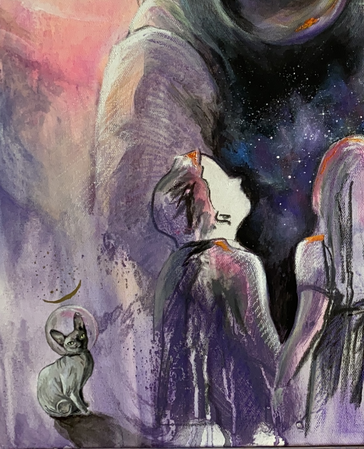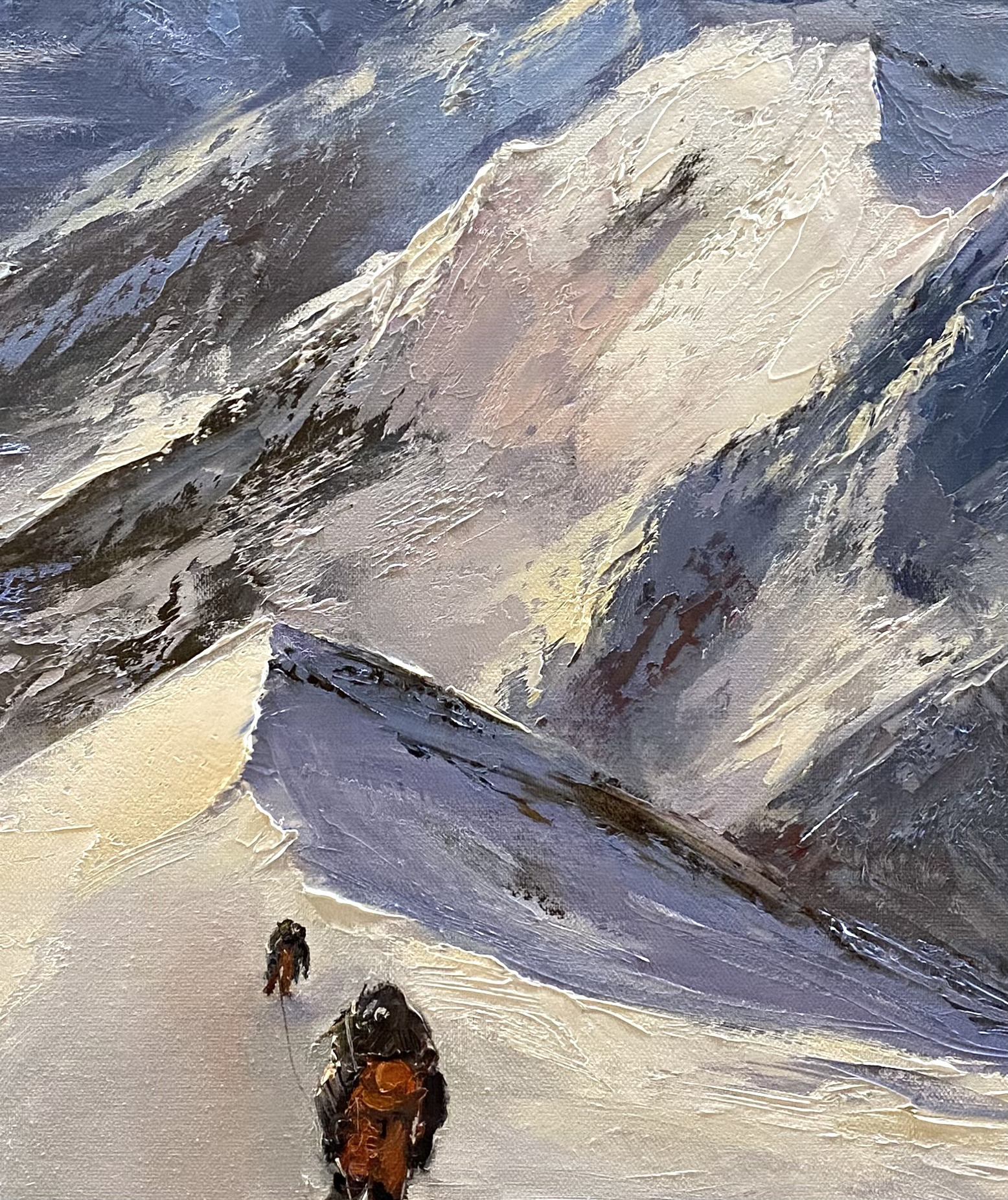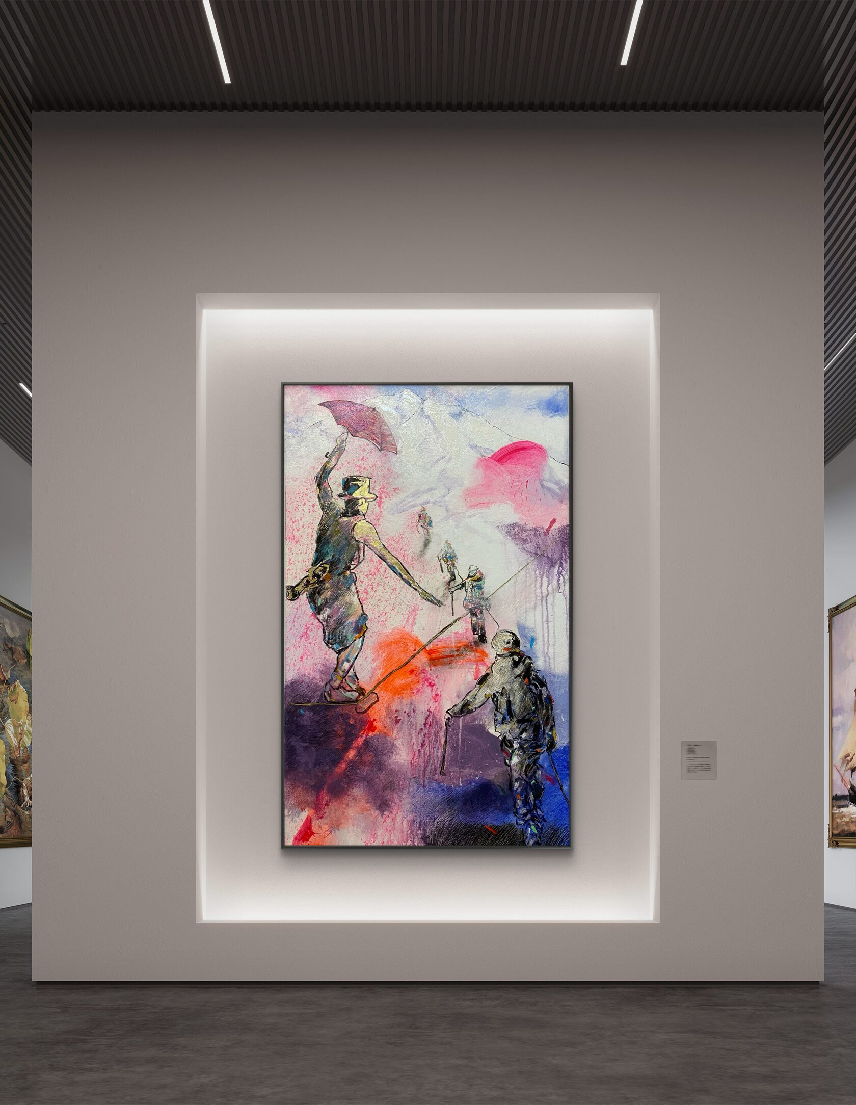 Картина на холсте без подрамника, транспортируется свернутой в тубу (необходимая мера для транспортировки заграницу). Также возможна натяжка на подрамник и отправка в готовом виде. Абстрактная картина на тему альпинизма. Метафортическое сравнение канатоходца и альпинистов, зачастую их жизни зависят от умения владеть веревкой.