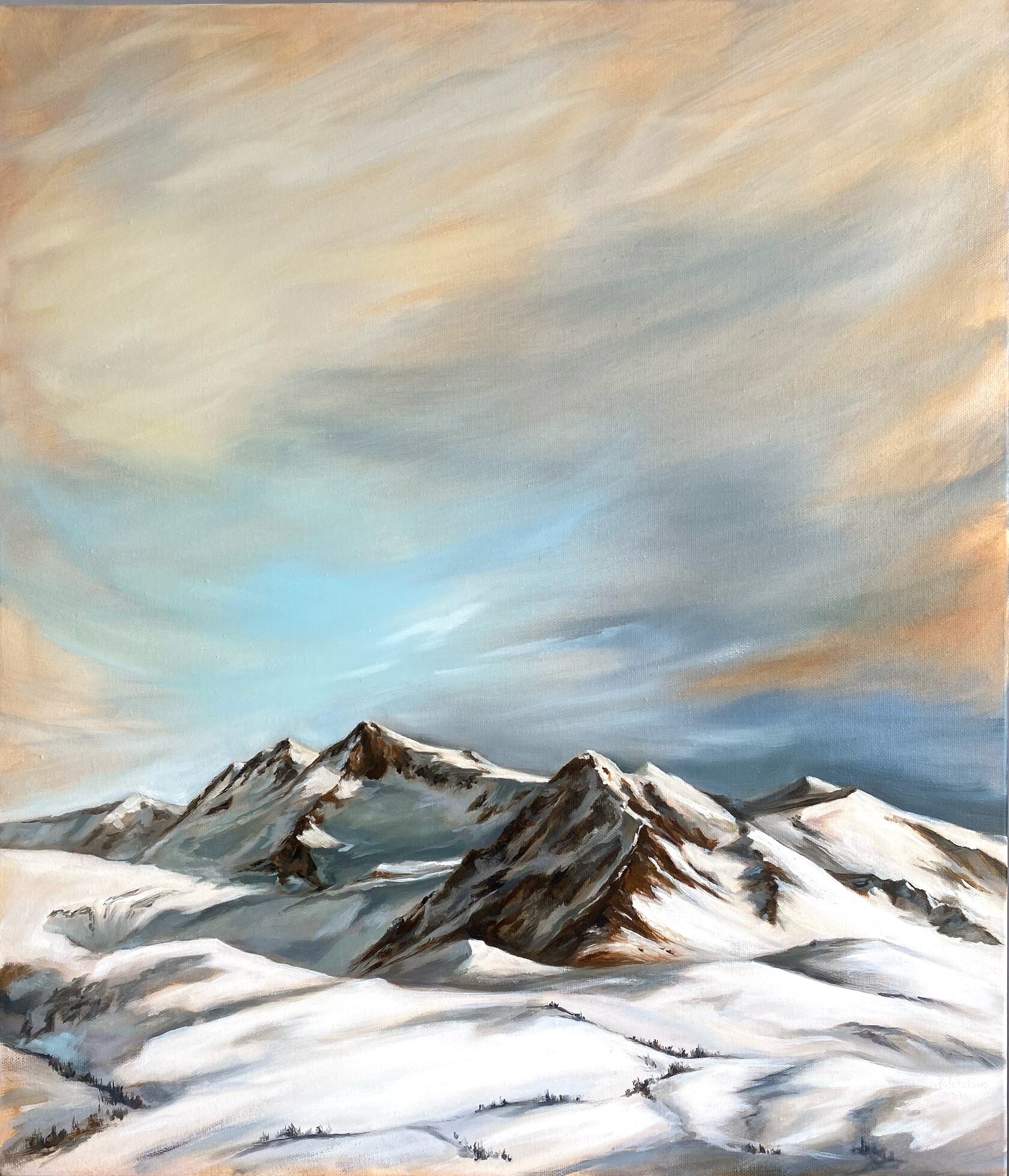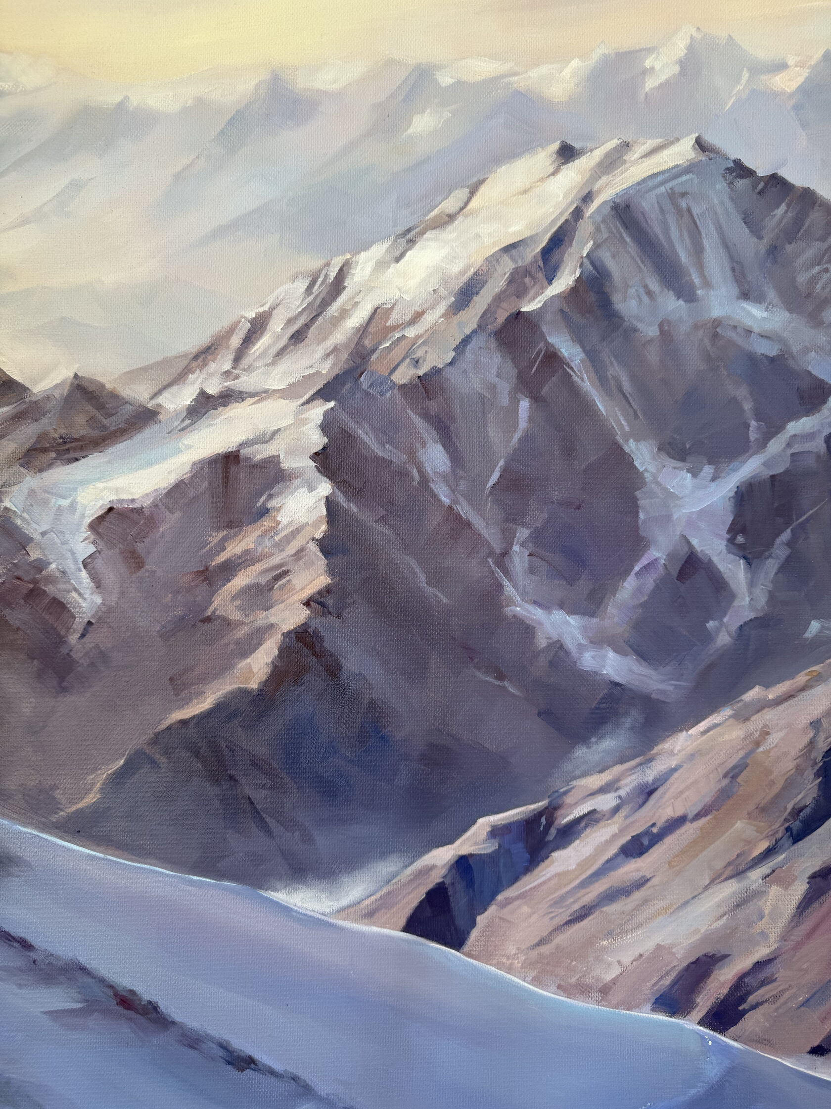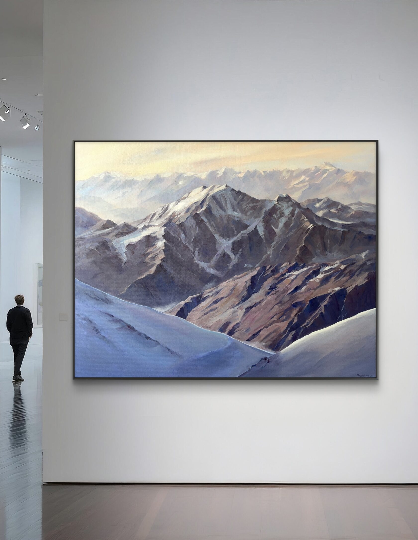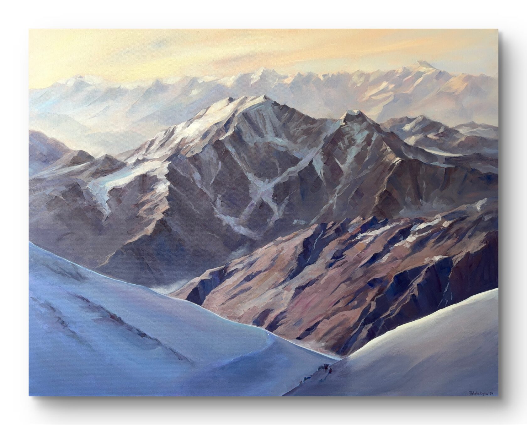 Масляный пейзаж в мягких тонах, снежные горы с теплым подтоном. Картина доступна к приобретению, рама L-canvas из натурального дерева (белый цвет) прилагается