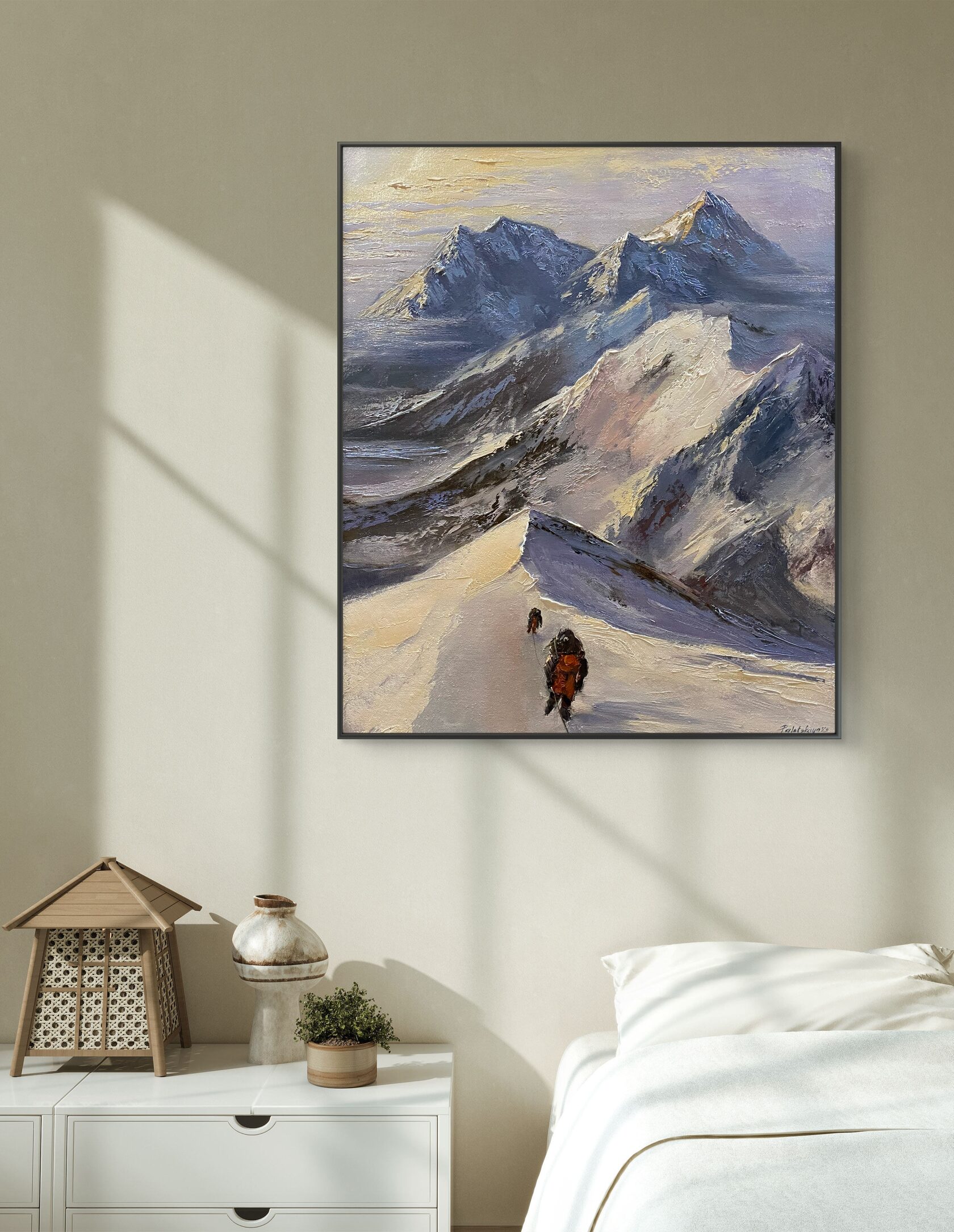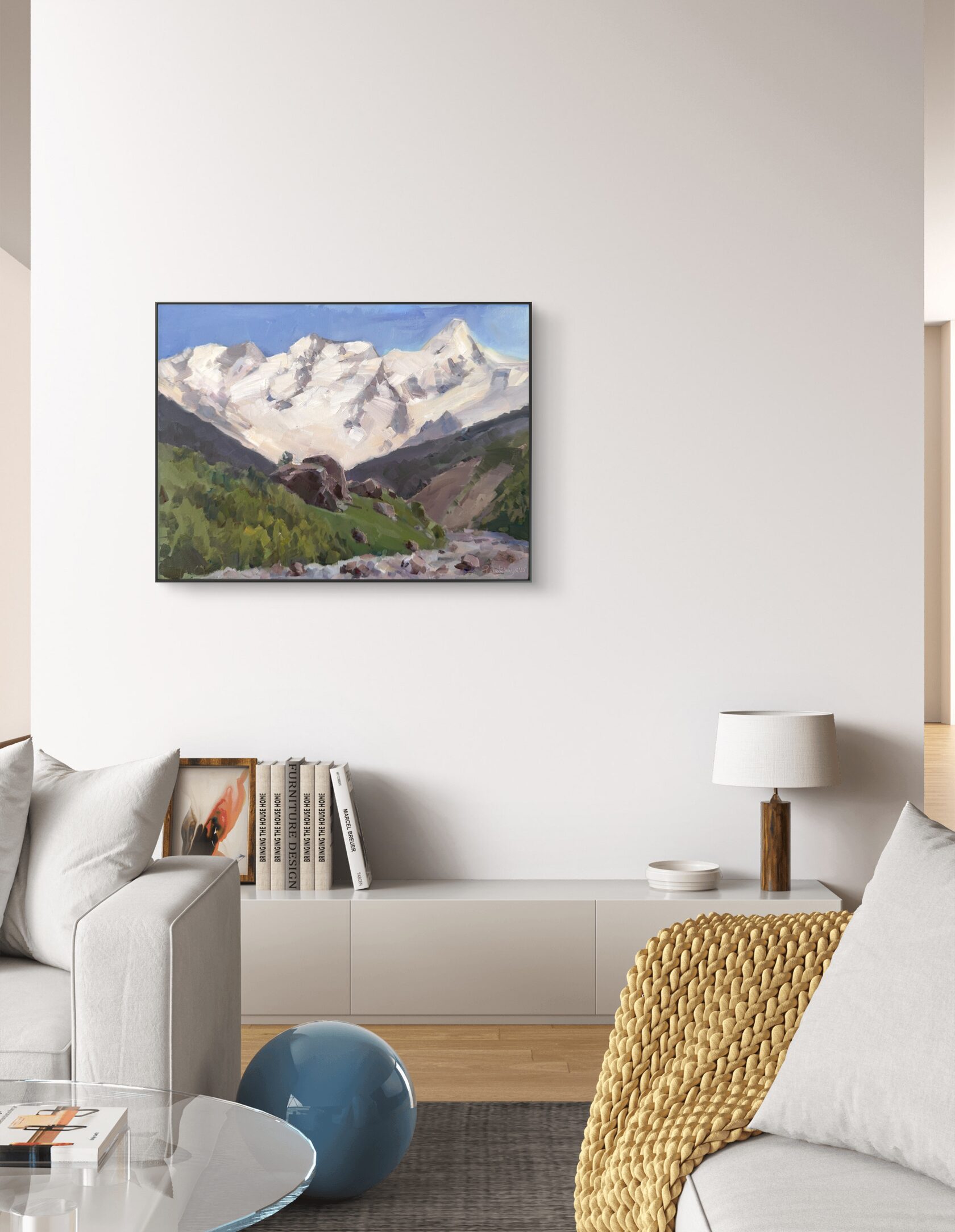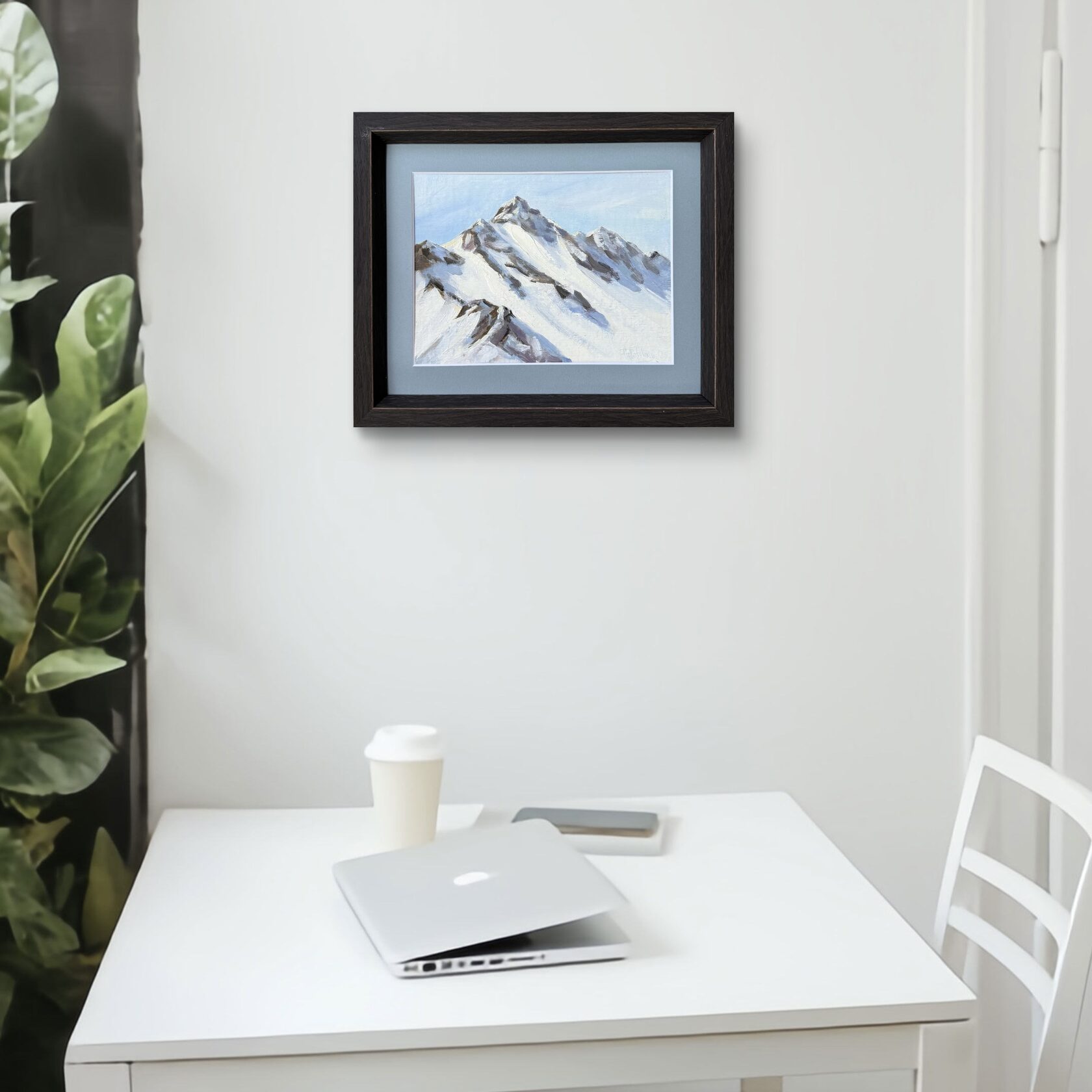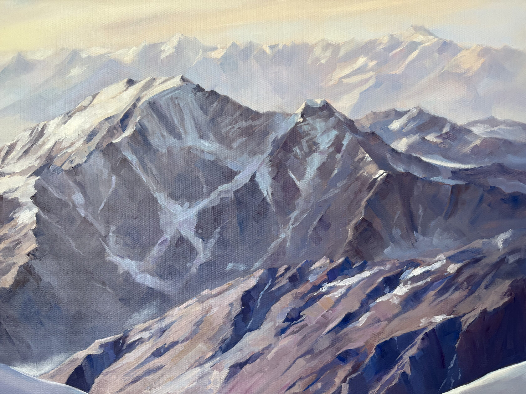 Масляный пейзаж в мягких тонах, снежные горы с теплым подтоном. Картина доступна к приобретению, рама L-canvas из натурального дерева (белый цвет) прилагается