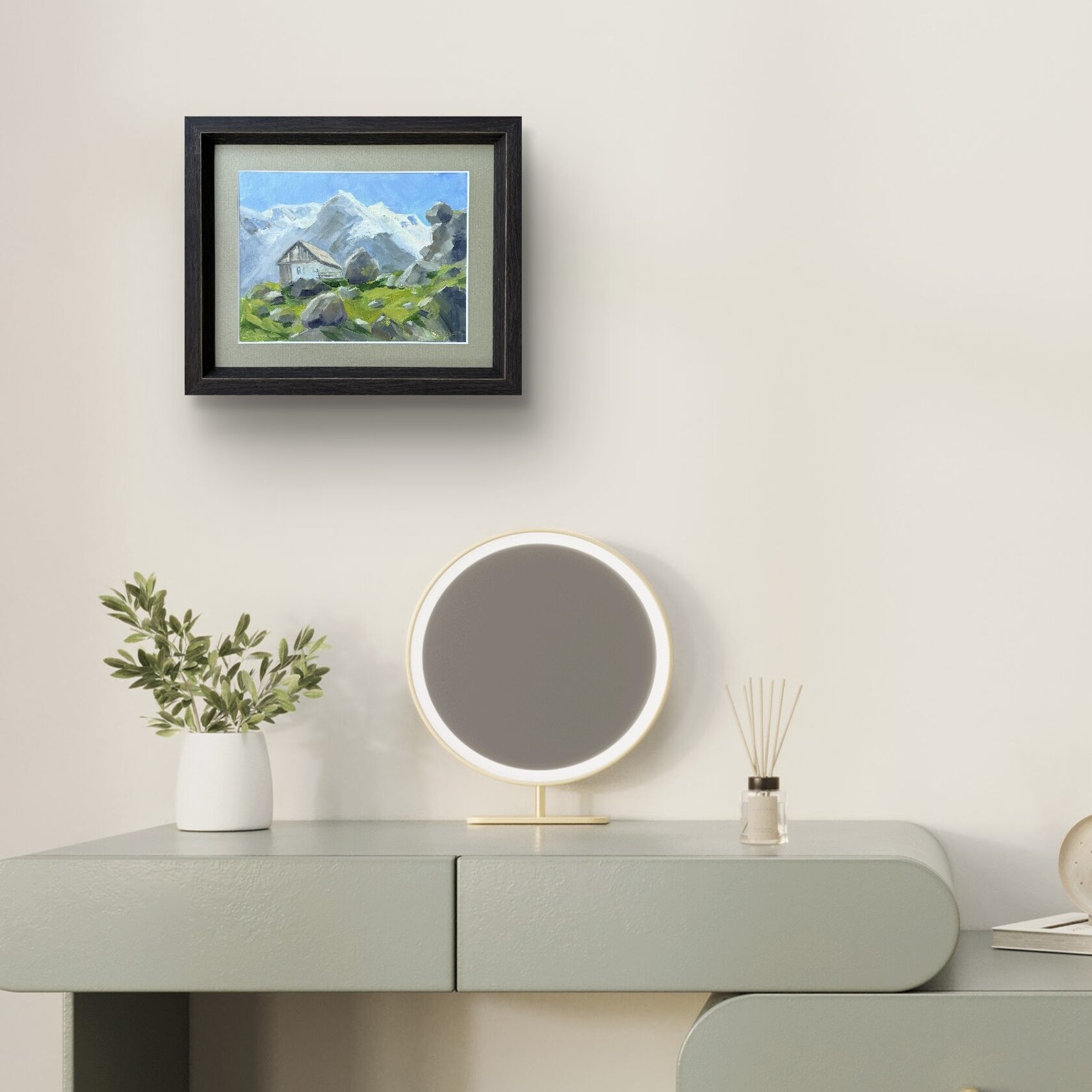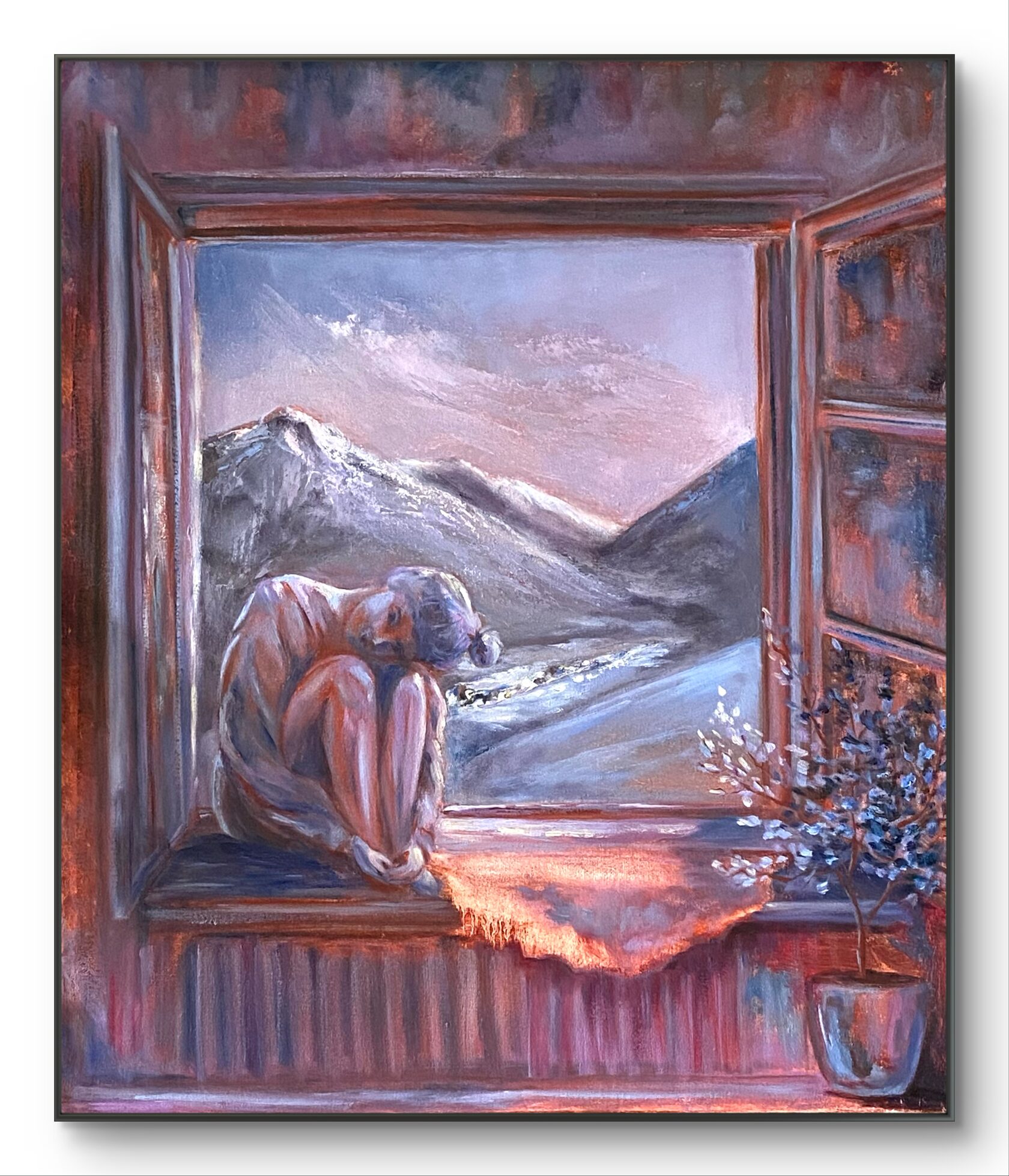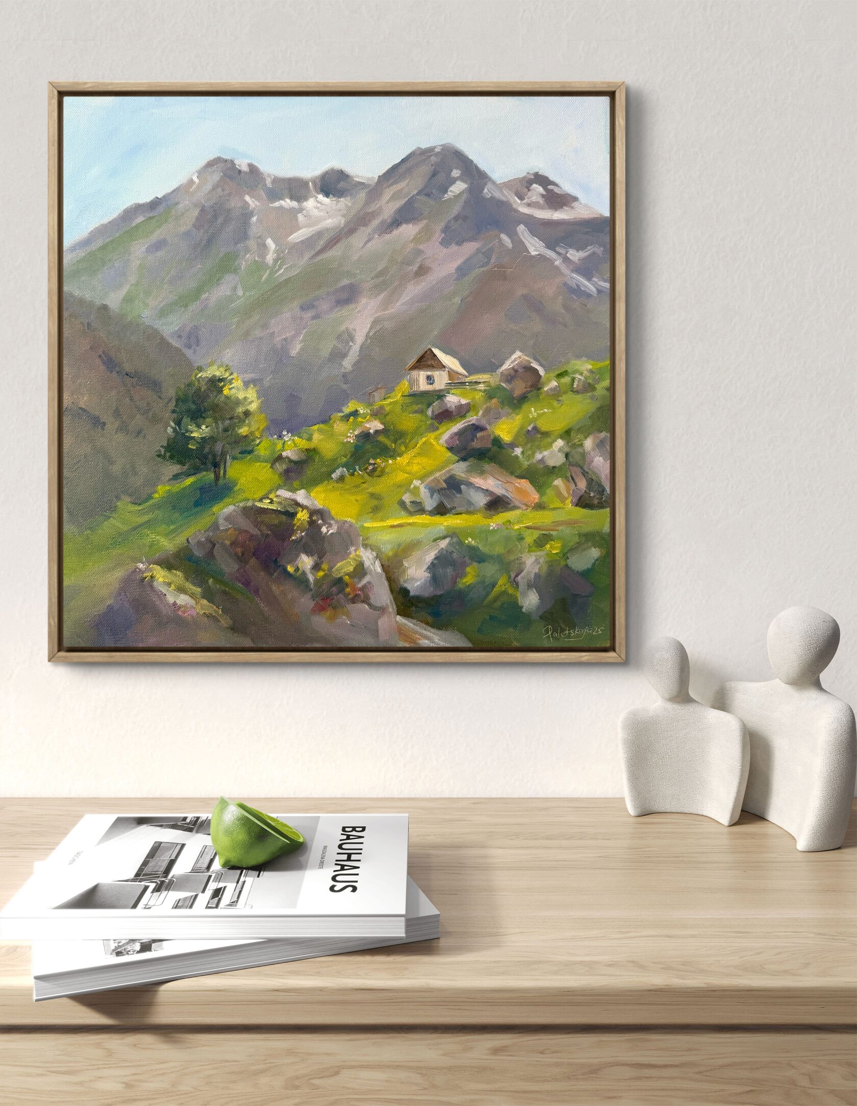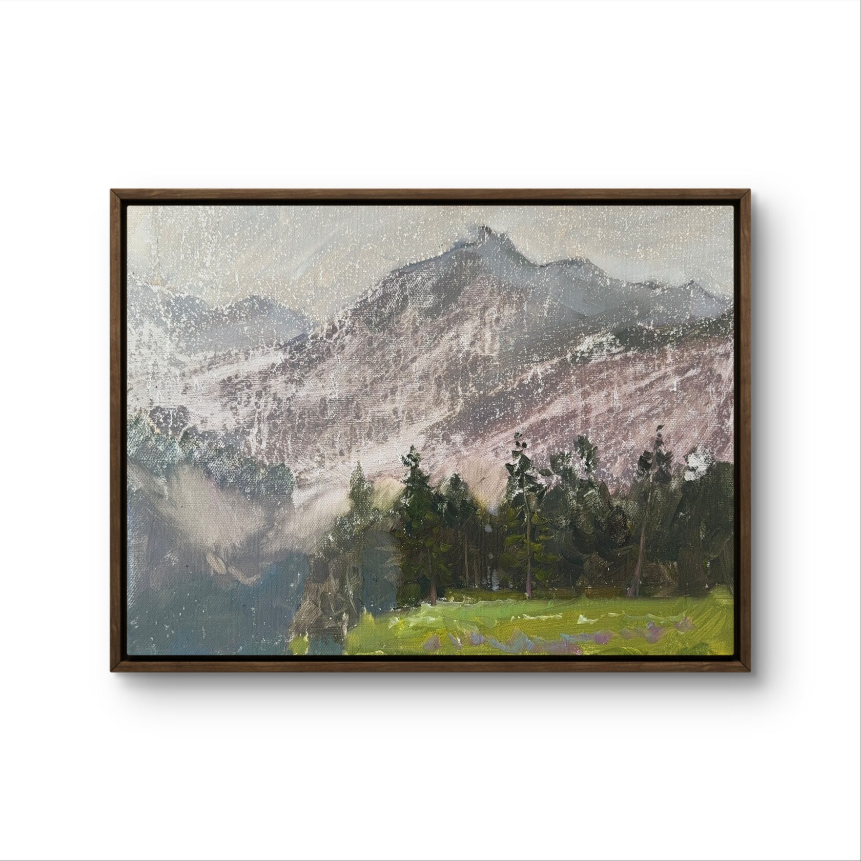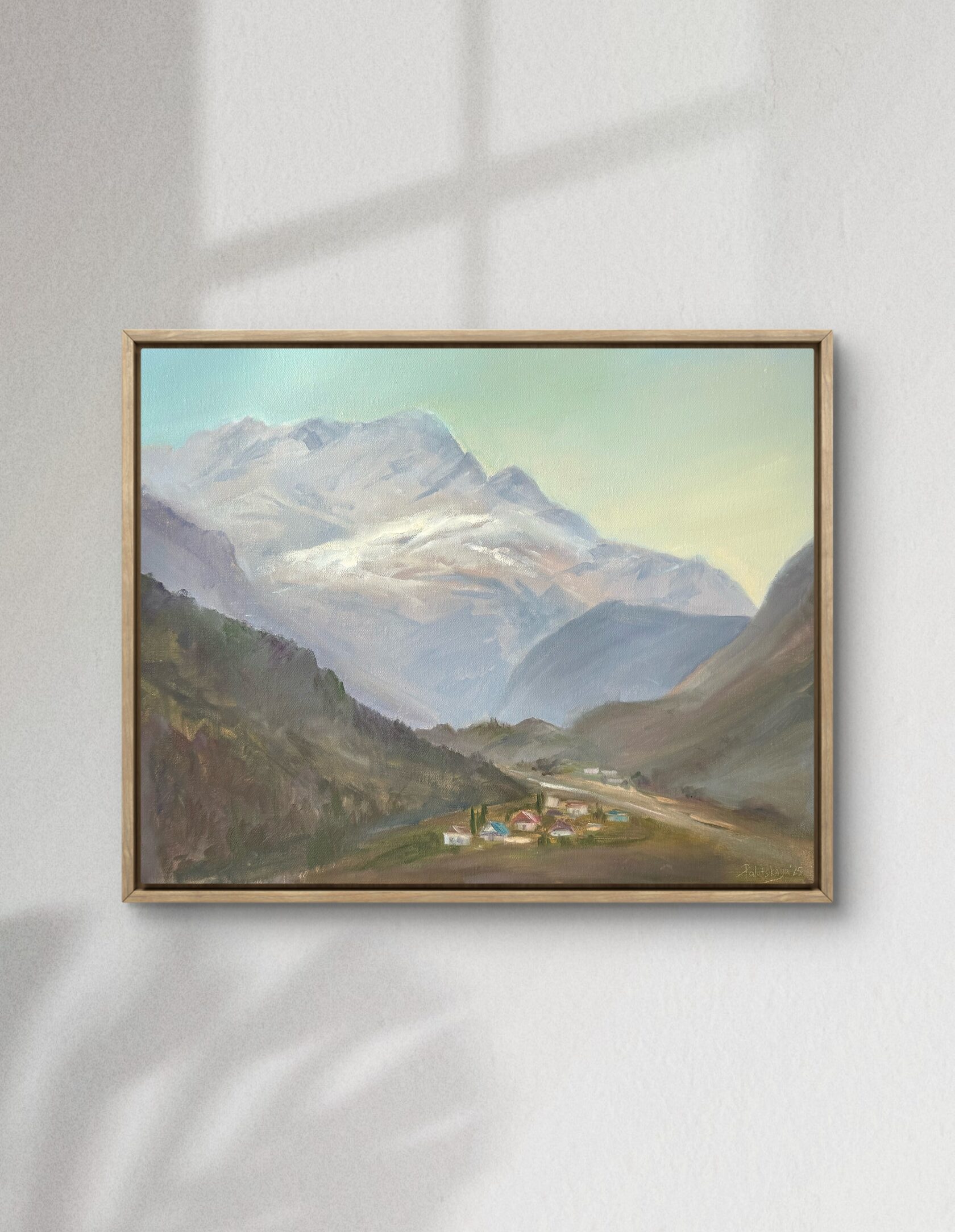 Масляный пейзаж в мягких тонах, снежные горы с теплым подтоном. Картина доступна к приобретению, рама L-canvas из натурального дерева (белый цвет) прилагается