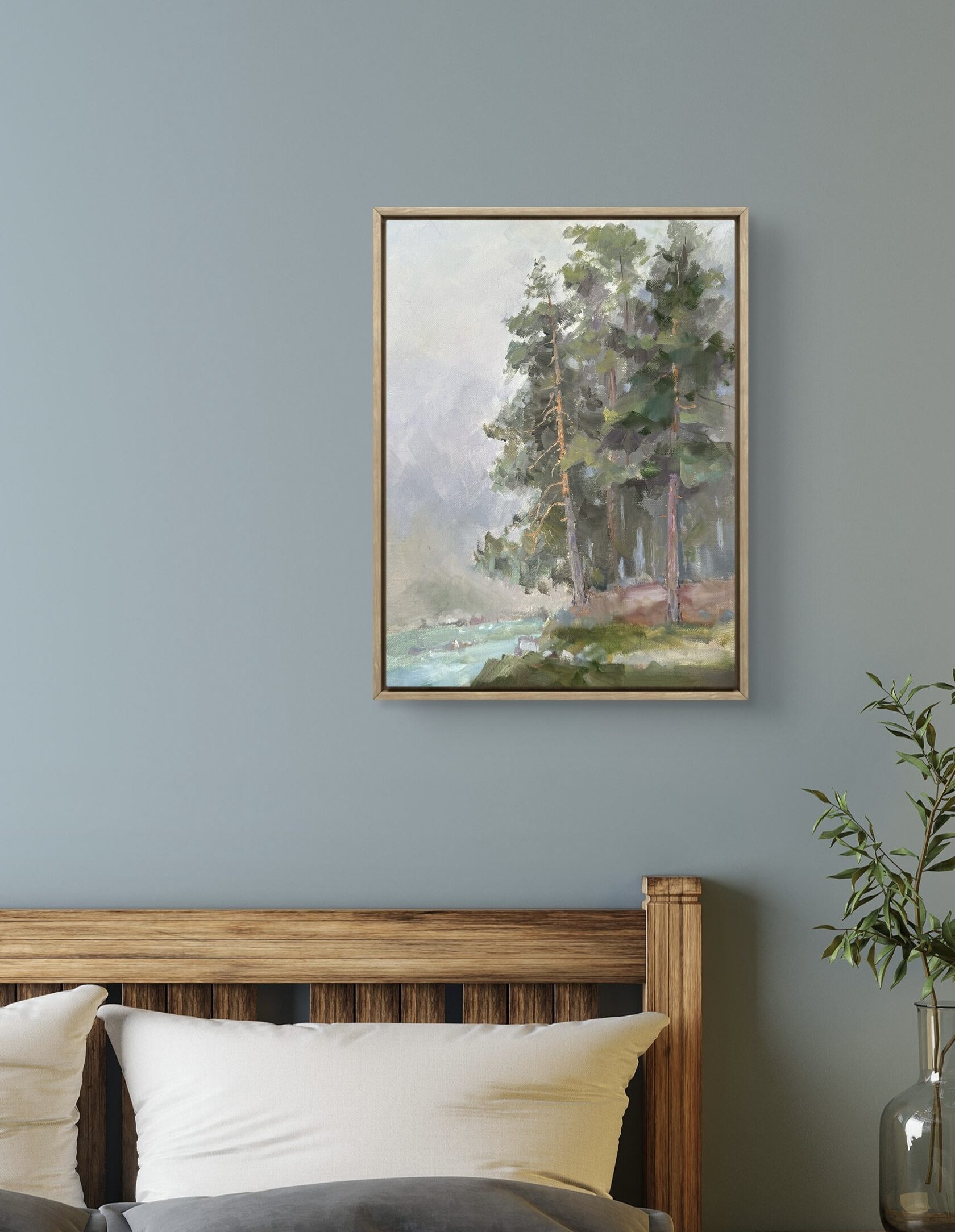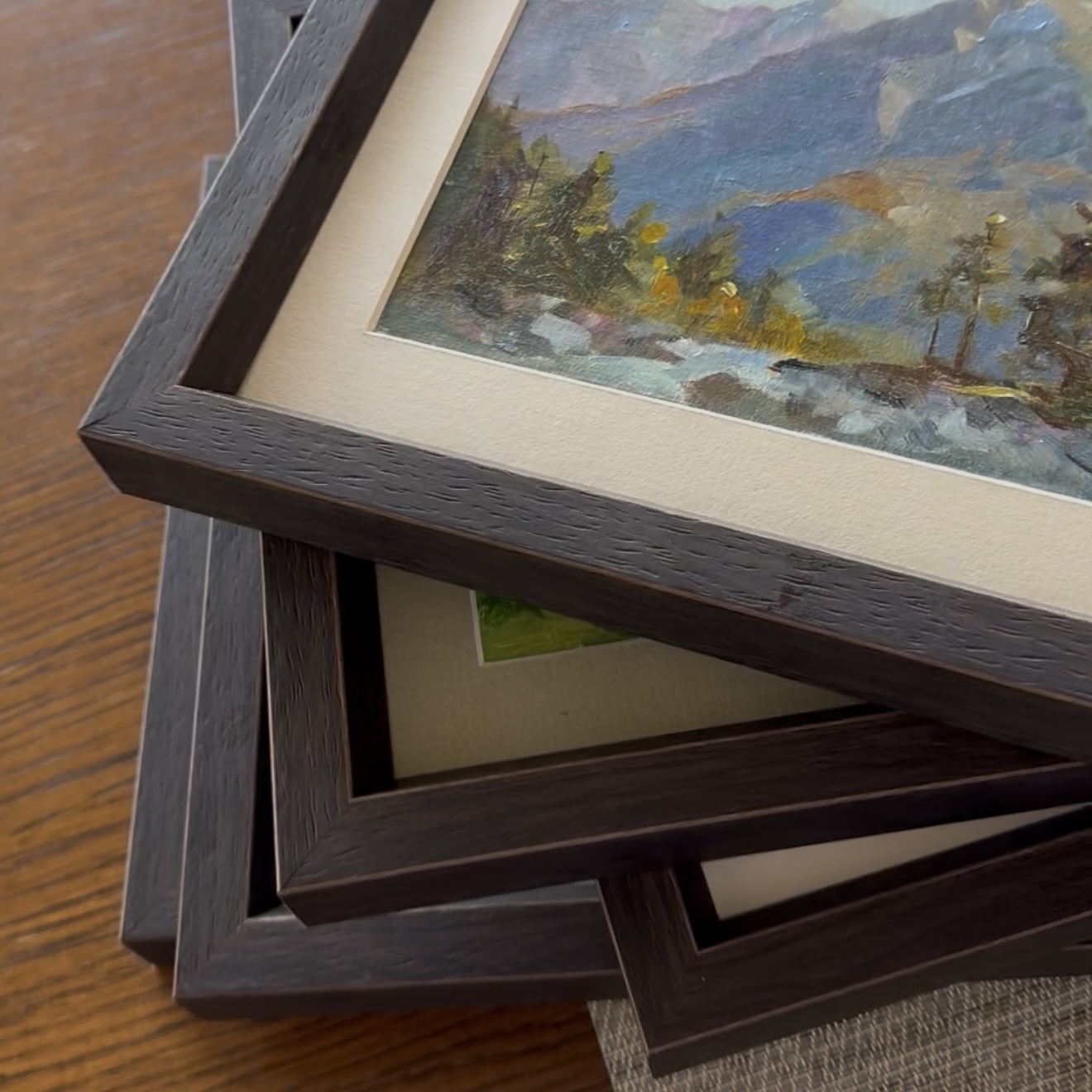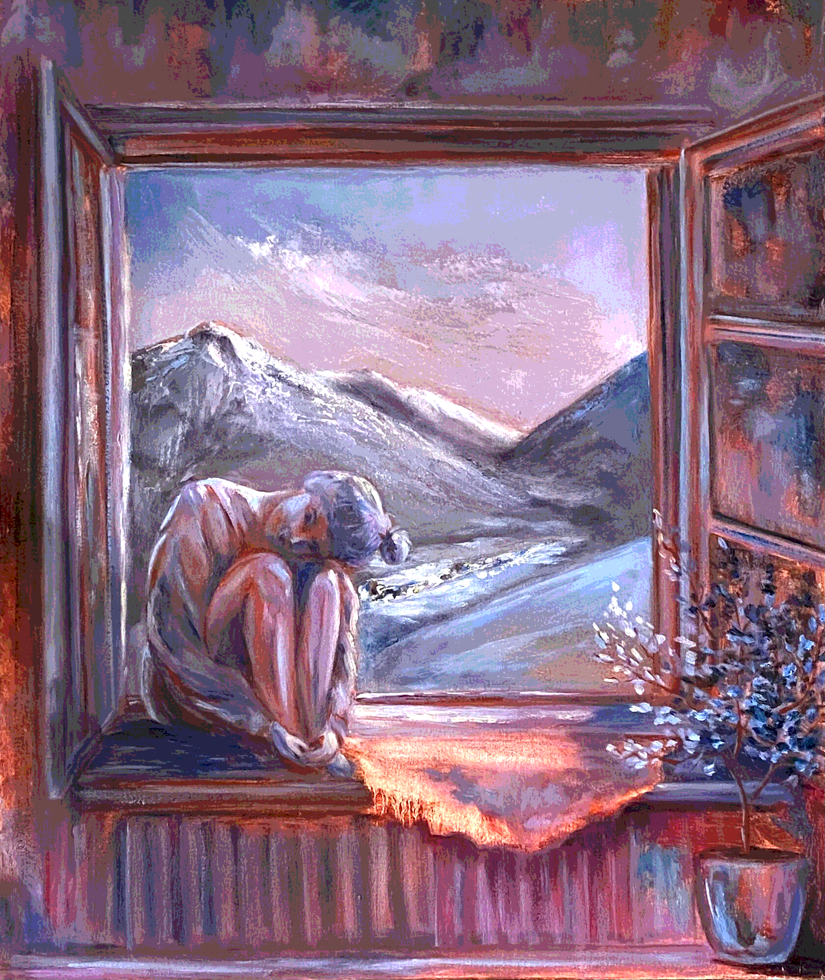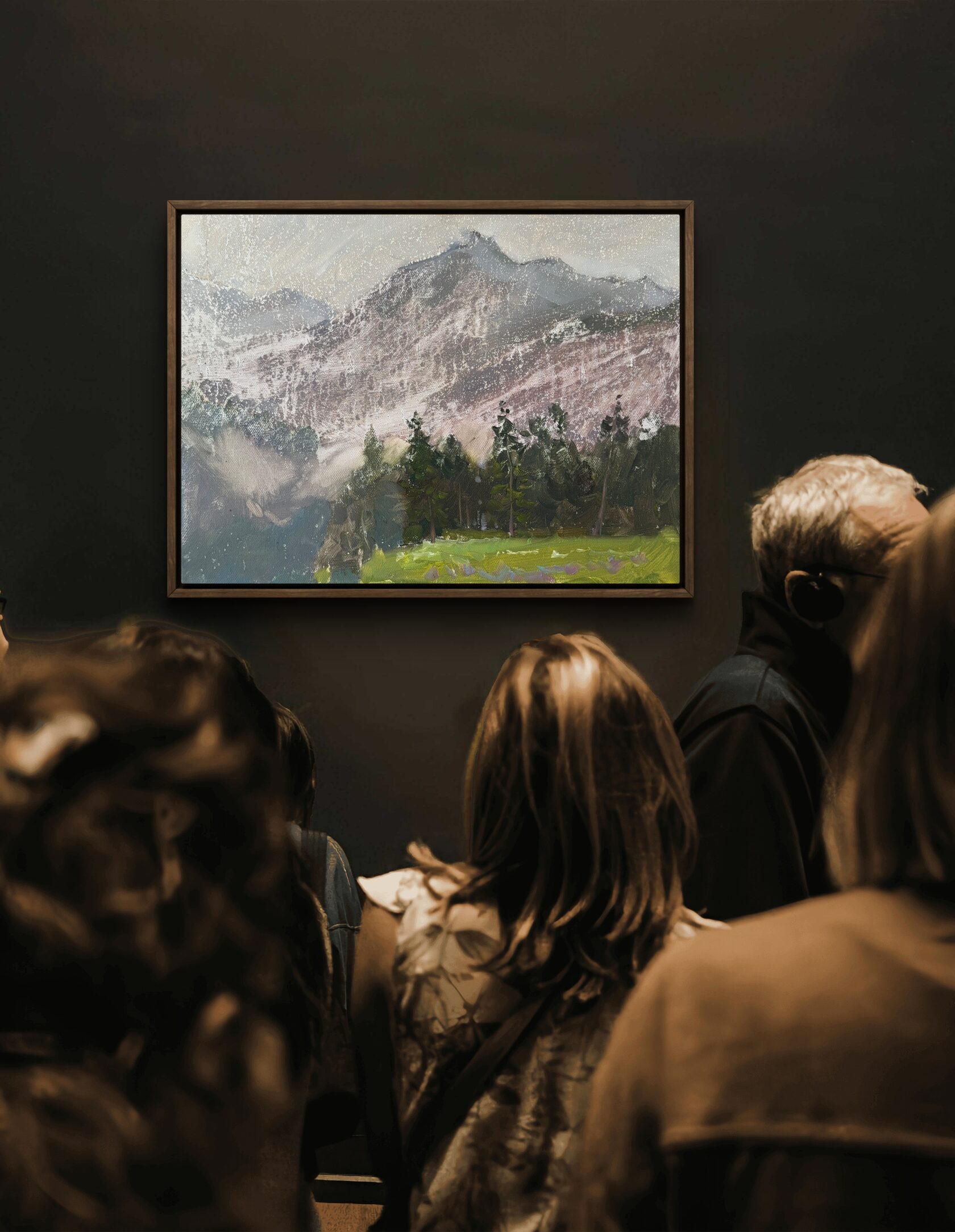 Масляный пейзаж в мягких тонах, снежные горы с теплым подтоном. Картина доступна к приобретению, рама L-canvas из натурального дерева (белый цвет) прилагается