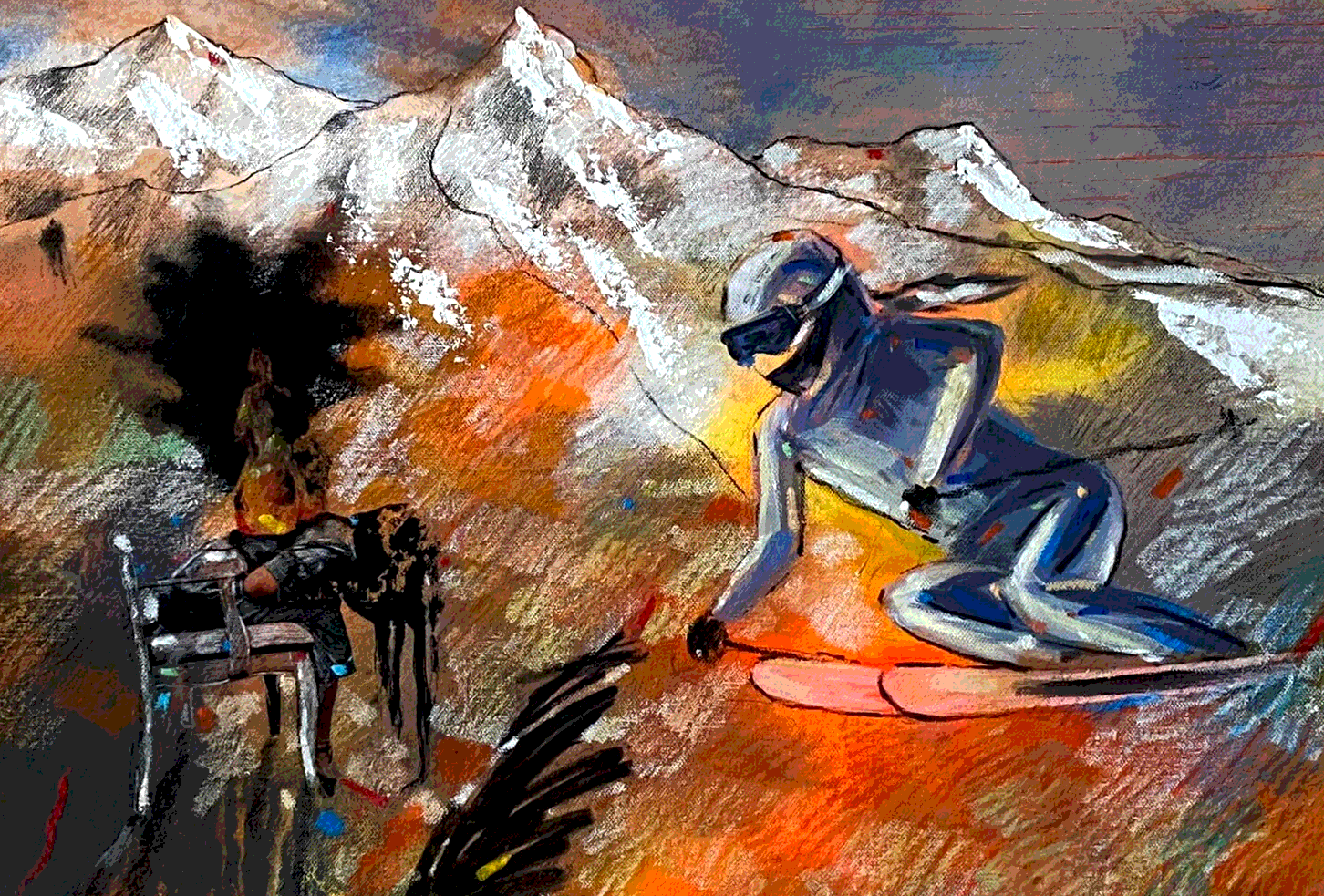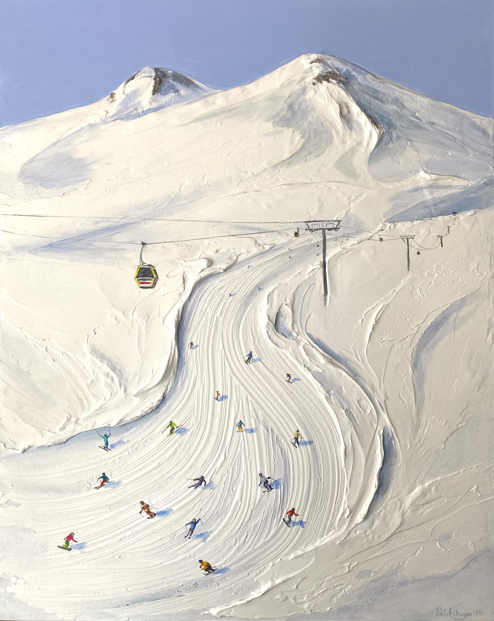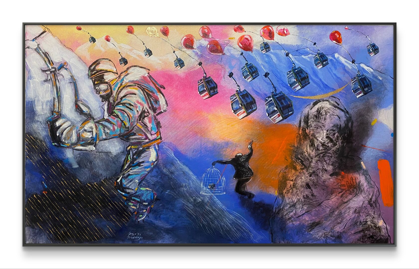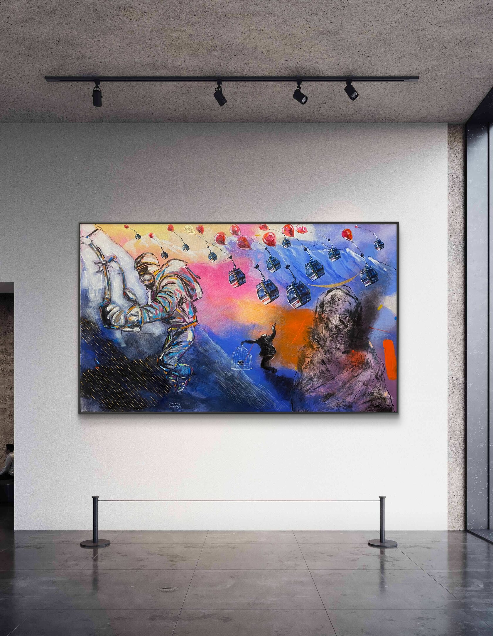 Картина на холсте без подрамника, транспортируется свернутой в тубу (необходимая мера для транспортировки заграницу). Также возможна натяжка на подрамник и отправка в готовом виде. Абстрактная картина. Метафортическое сравнение офисной жизни и свободы на склоне.
