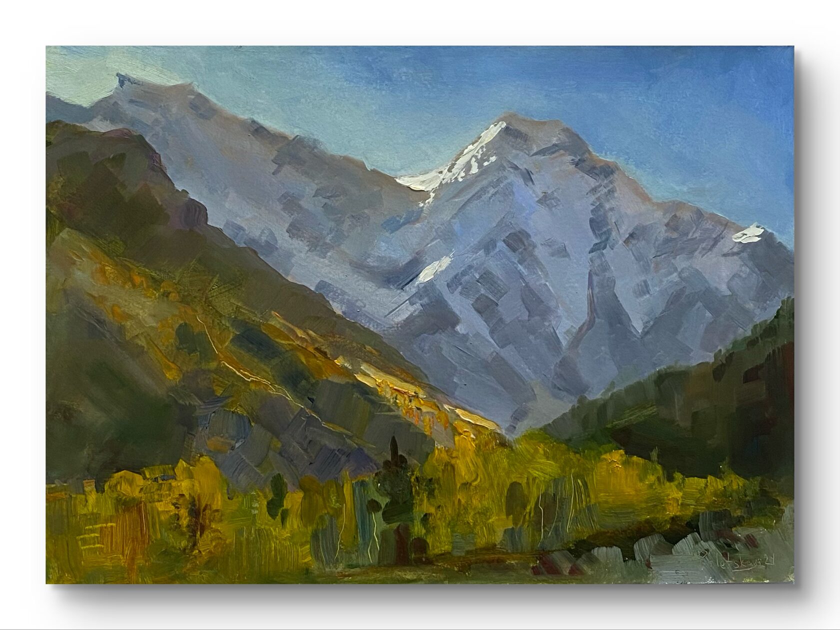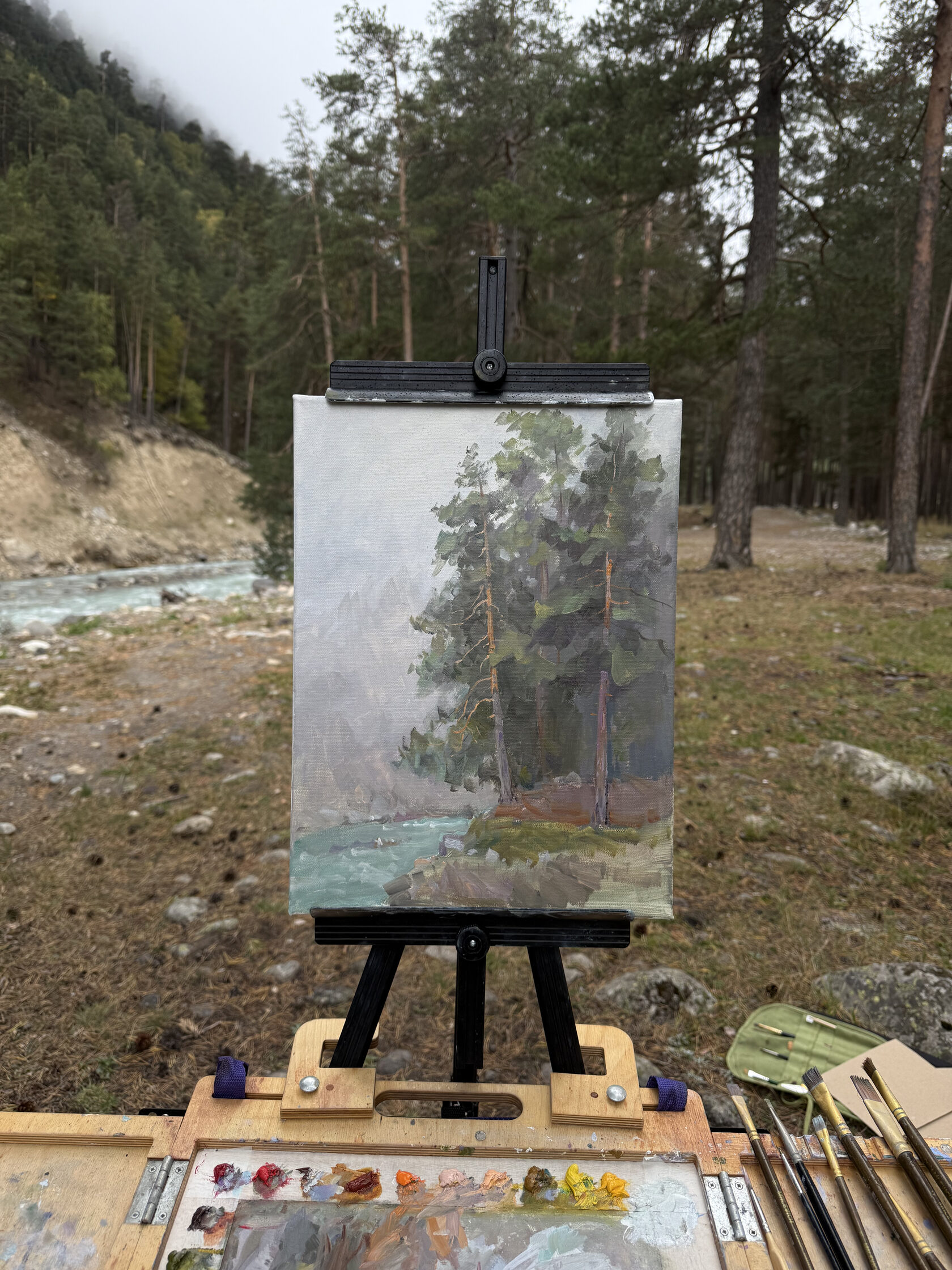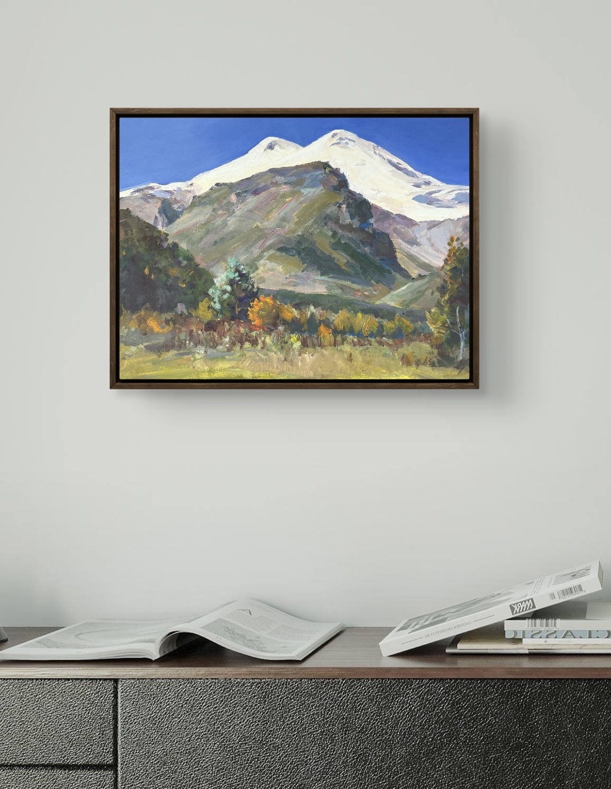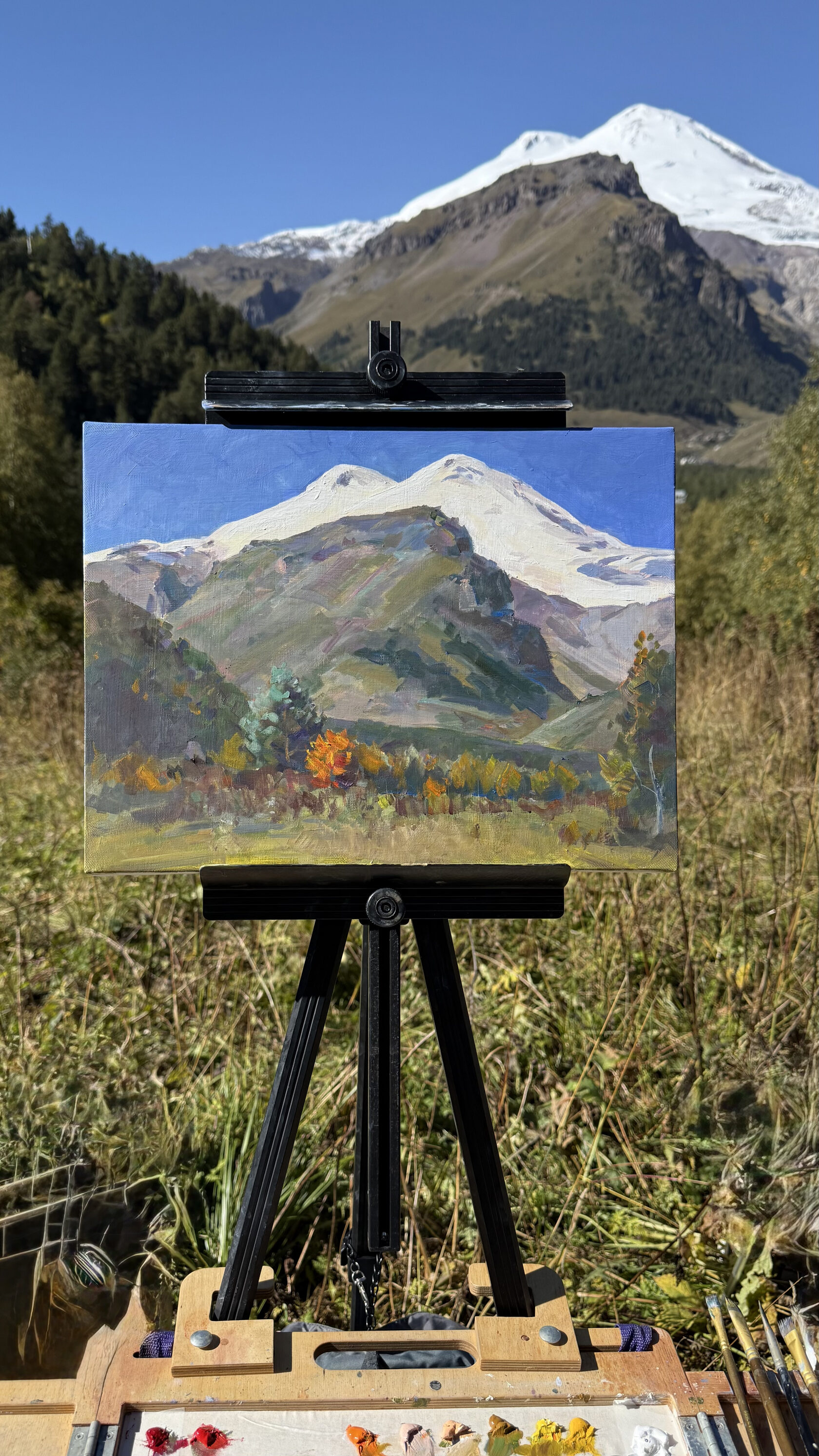 Очень солнечное, теплое состояние сентября. Локация за поляной Чегет, в сторону реки Донгузорун Масляный этюд написанный вживую. Холст на подрамнике, подвесы входят в комплект. Возможно оформление в раму