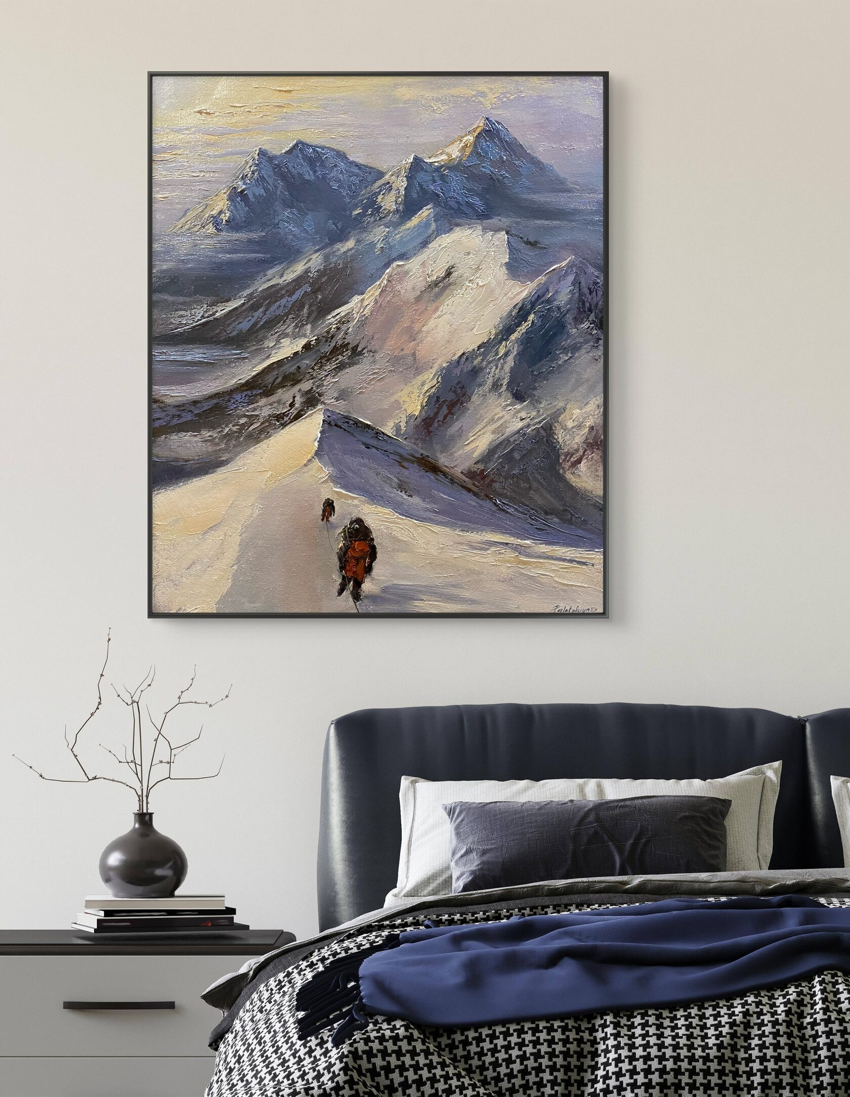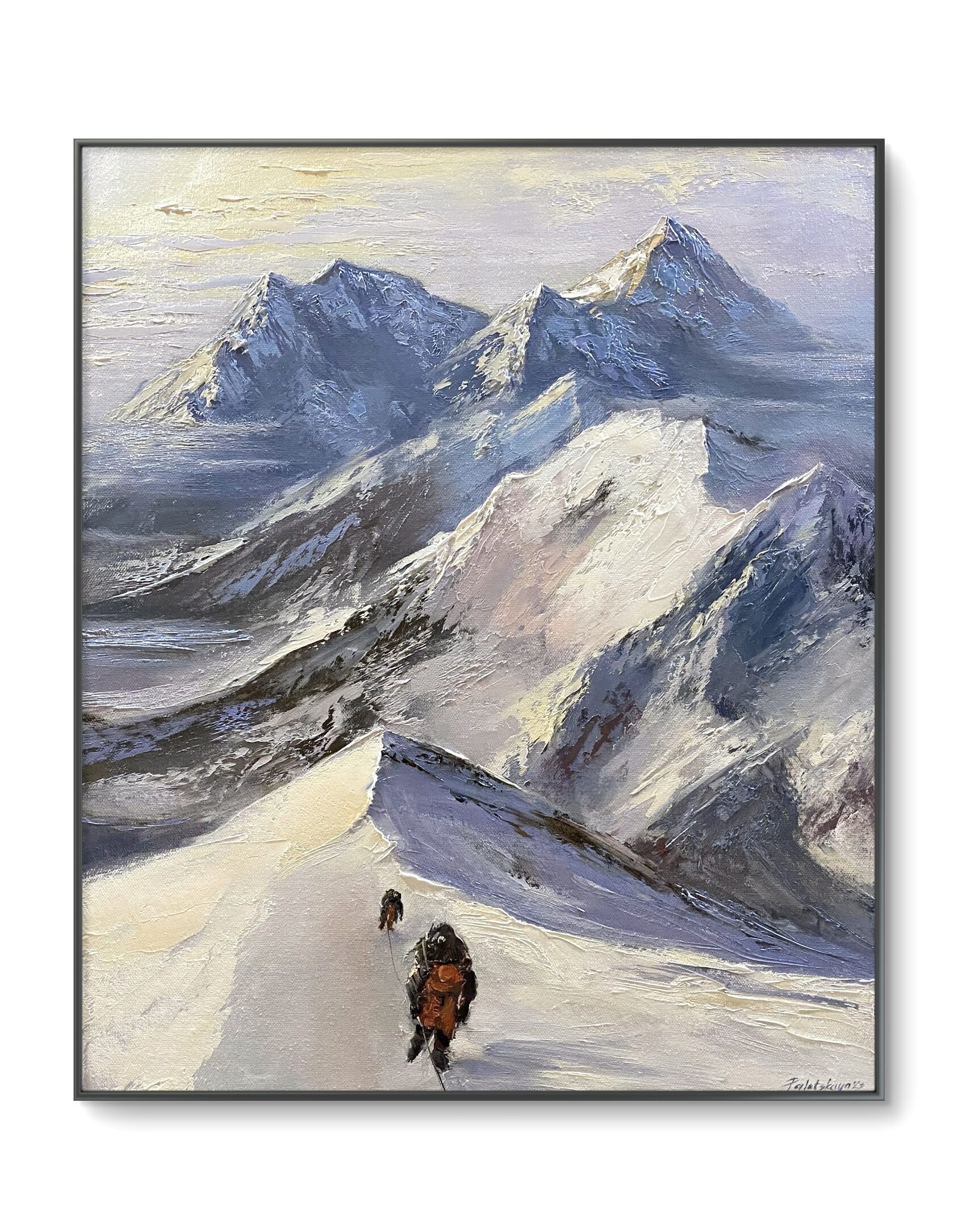 Абстрактная картина об альпинизме. Яркие, сочные краски, цветовые акценты и сюжетная линия через несколько образов. Картина на холсте без подрамника, транспортируется свернутой в тубу (необходимая мера для транспортировки заграницу). Также возможна натяжка на подрамник и отправка в готовом виде.