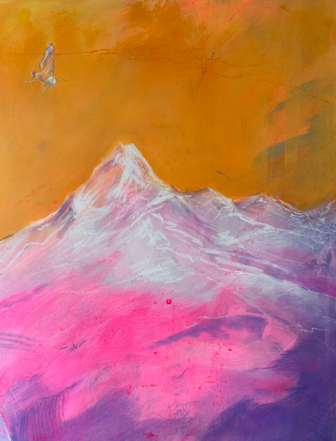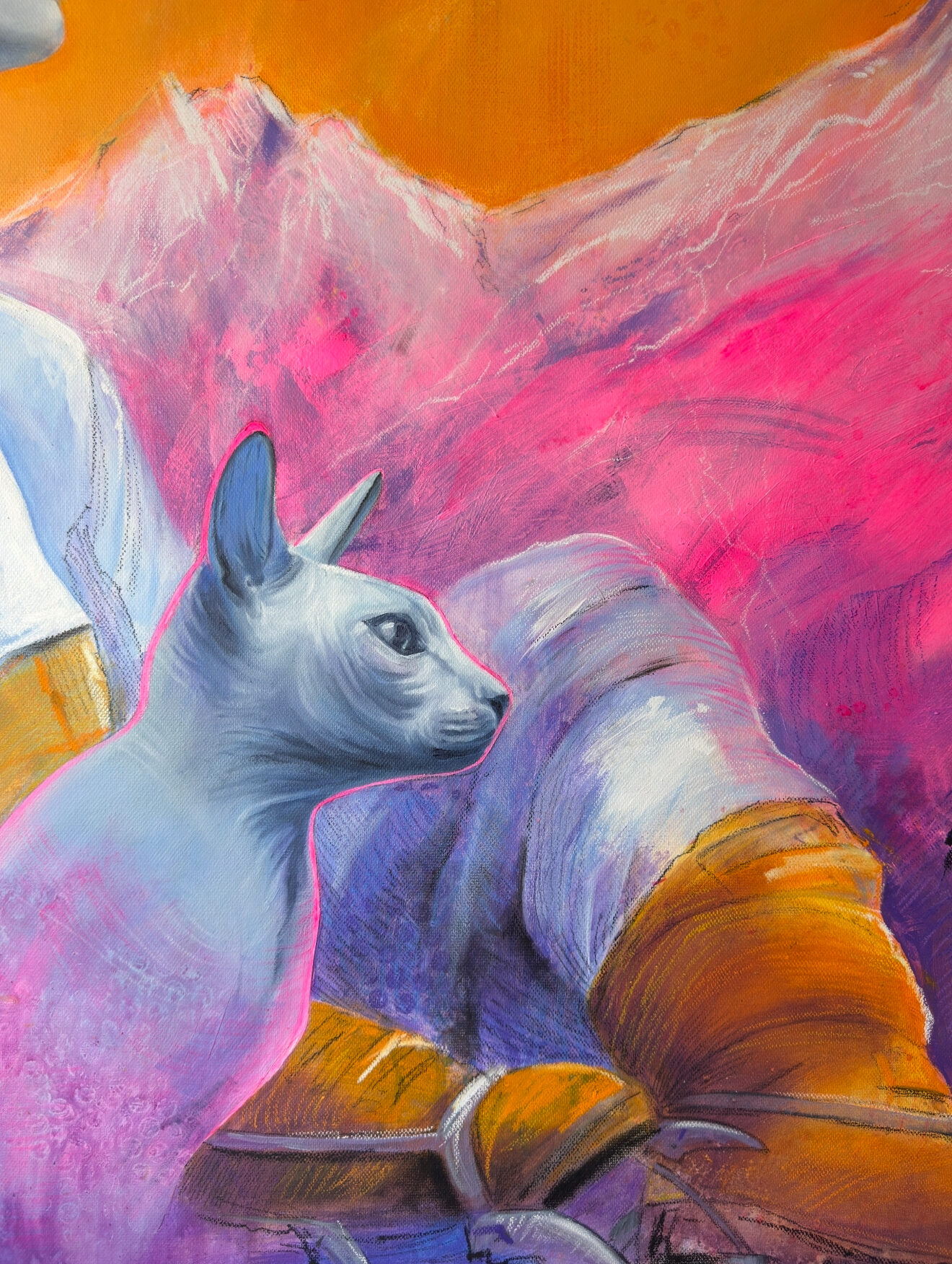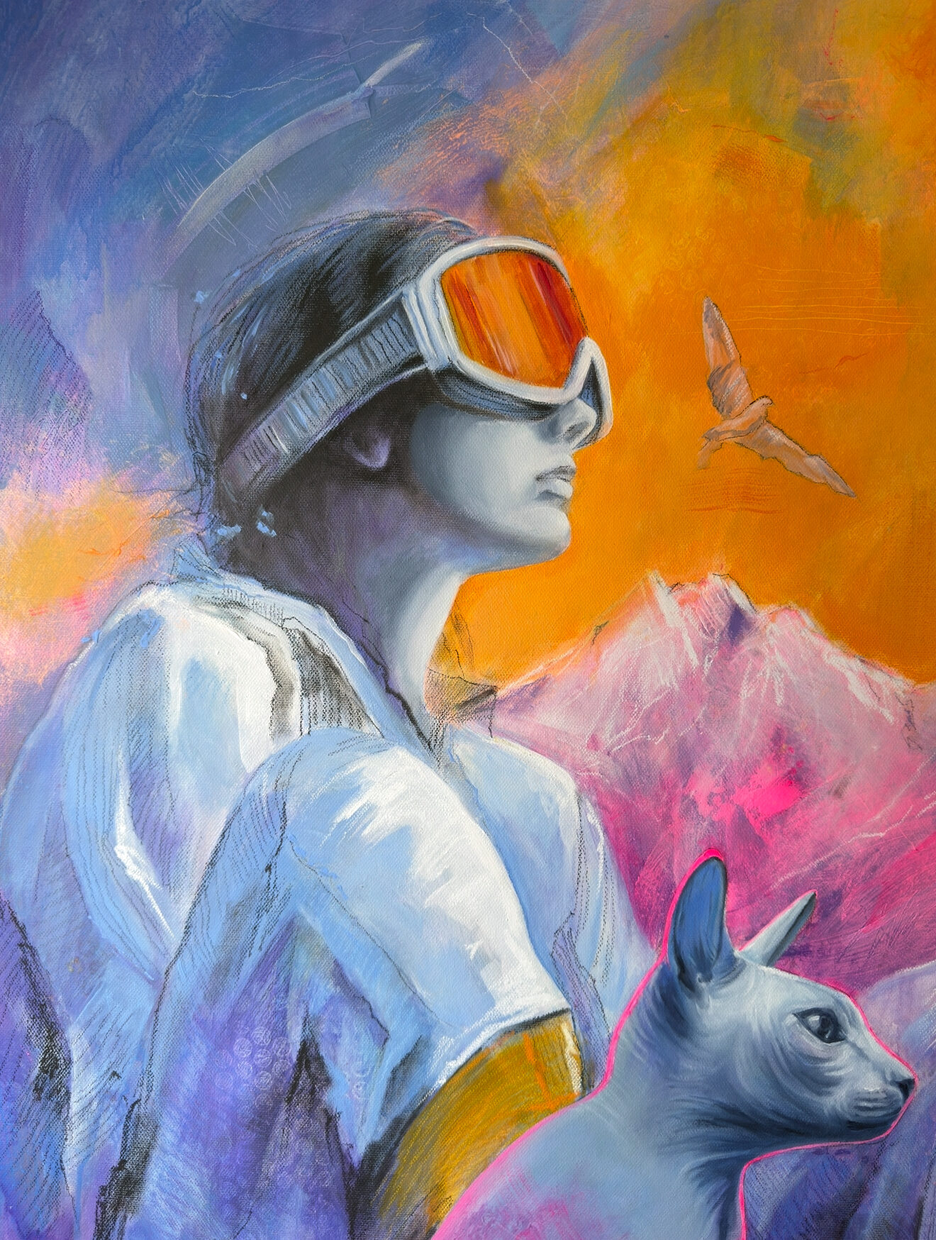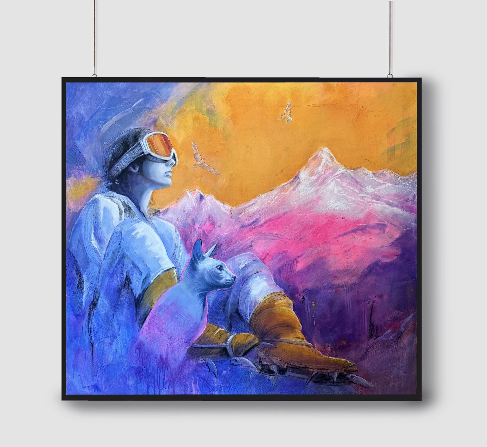 Первая картина в проекте "Нежность гор". Образ женщины в начале пути к большим горам. Пока без суровости и испытаний - только романтизация и интерес к высоте. Горы яркие и легкие как первое впечатление. Кошка рядом и альпинистские кошки на ее ногах - визуальный тандем. Одна про интуицию и мягкость, другие - про первый контакт с техникой и маршрутом.