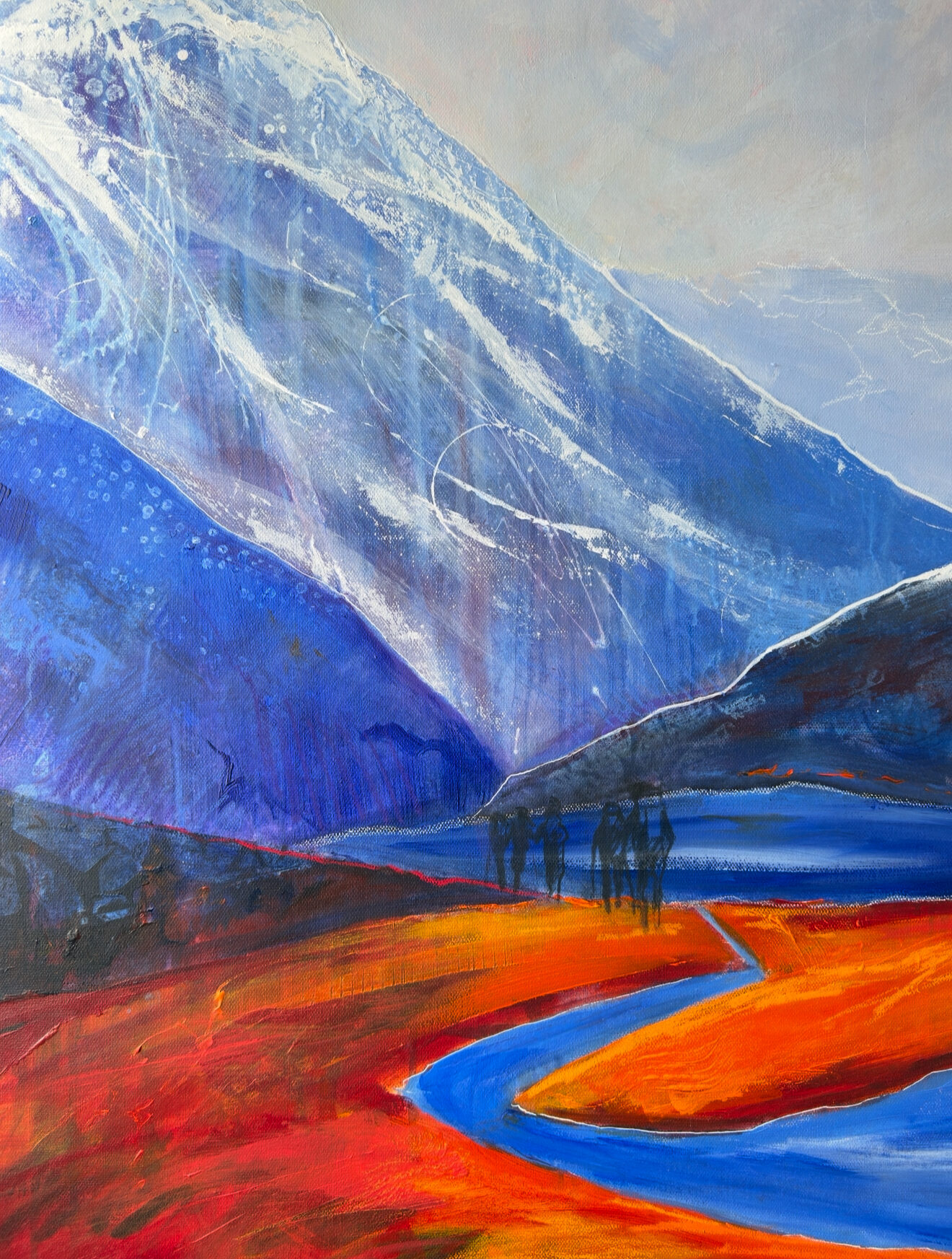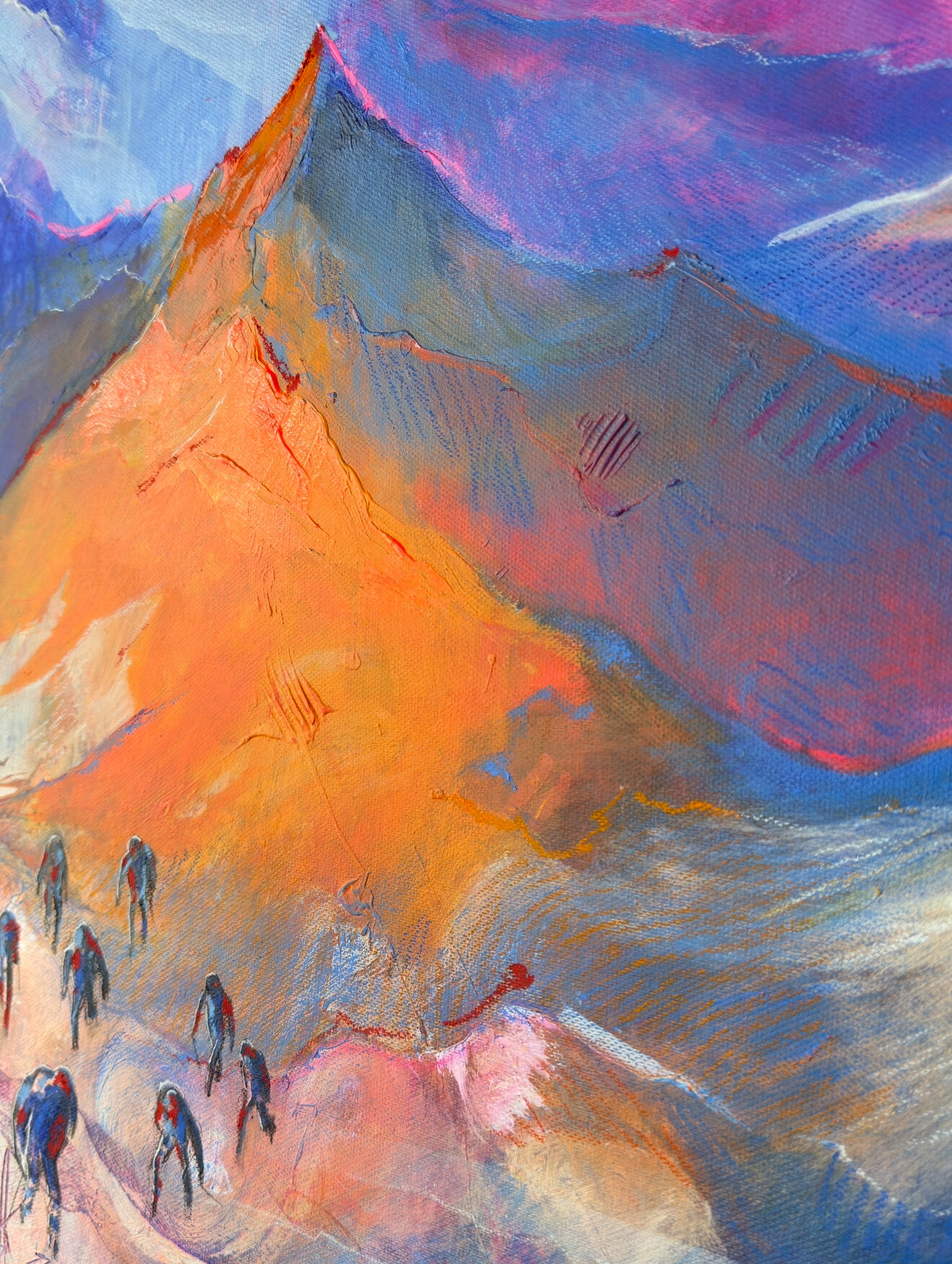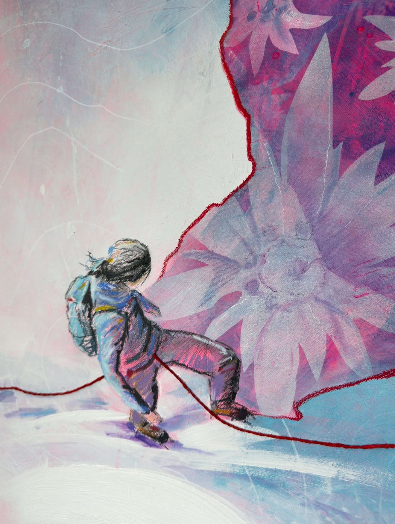 Картина на холсте без подрамника, транспортируется свернутой в тубу (необходимая мера для транспортировки заграницу). Также возможна натяжка на подрамник и отправка в готовом виде. Абстрактная картина. Метафортическое сравнение офисной жизни и свободы на склоне.