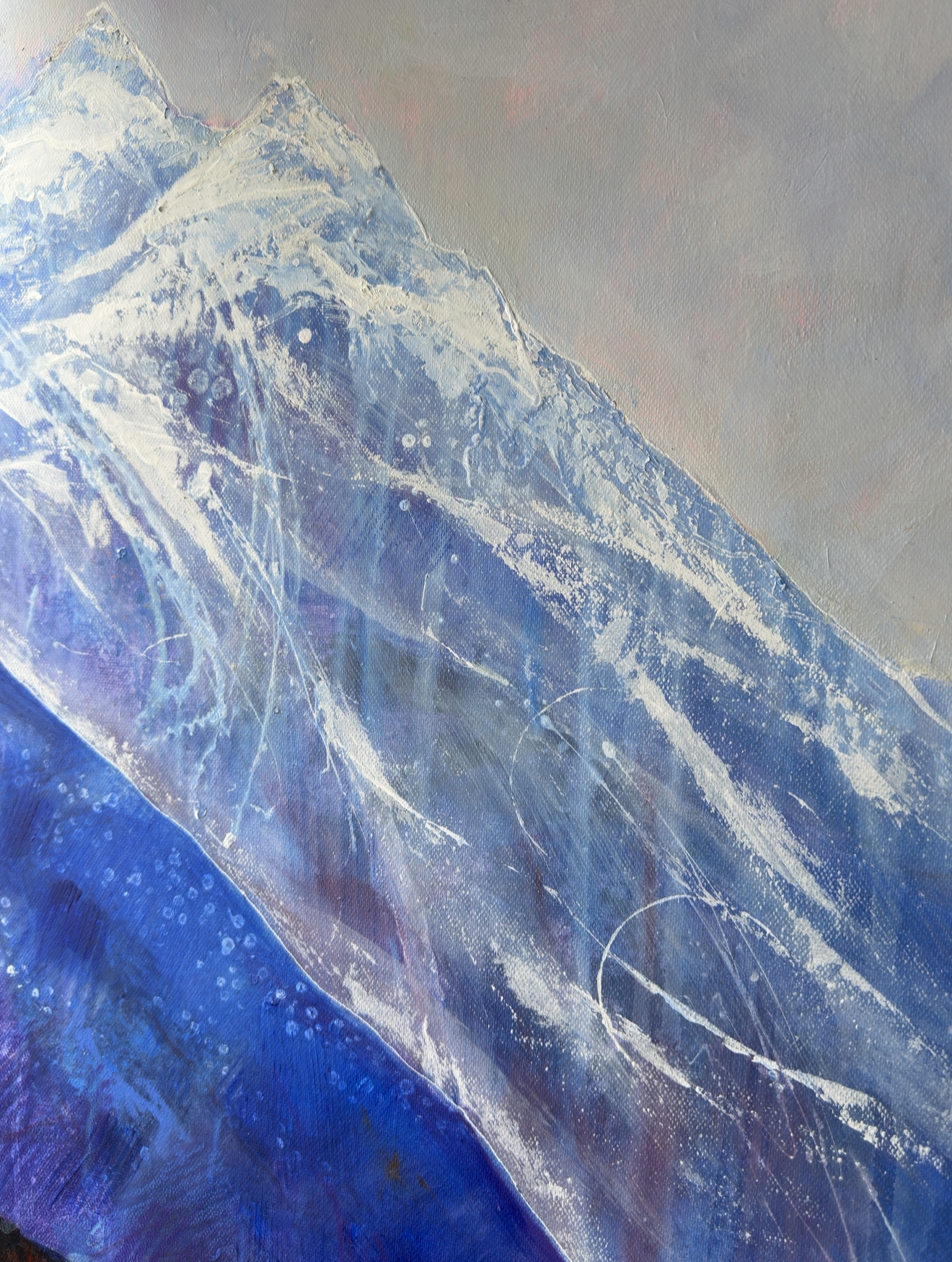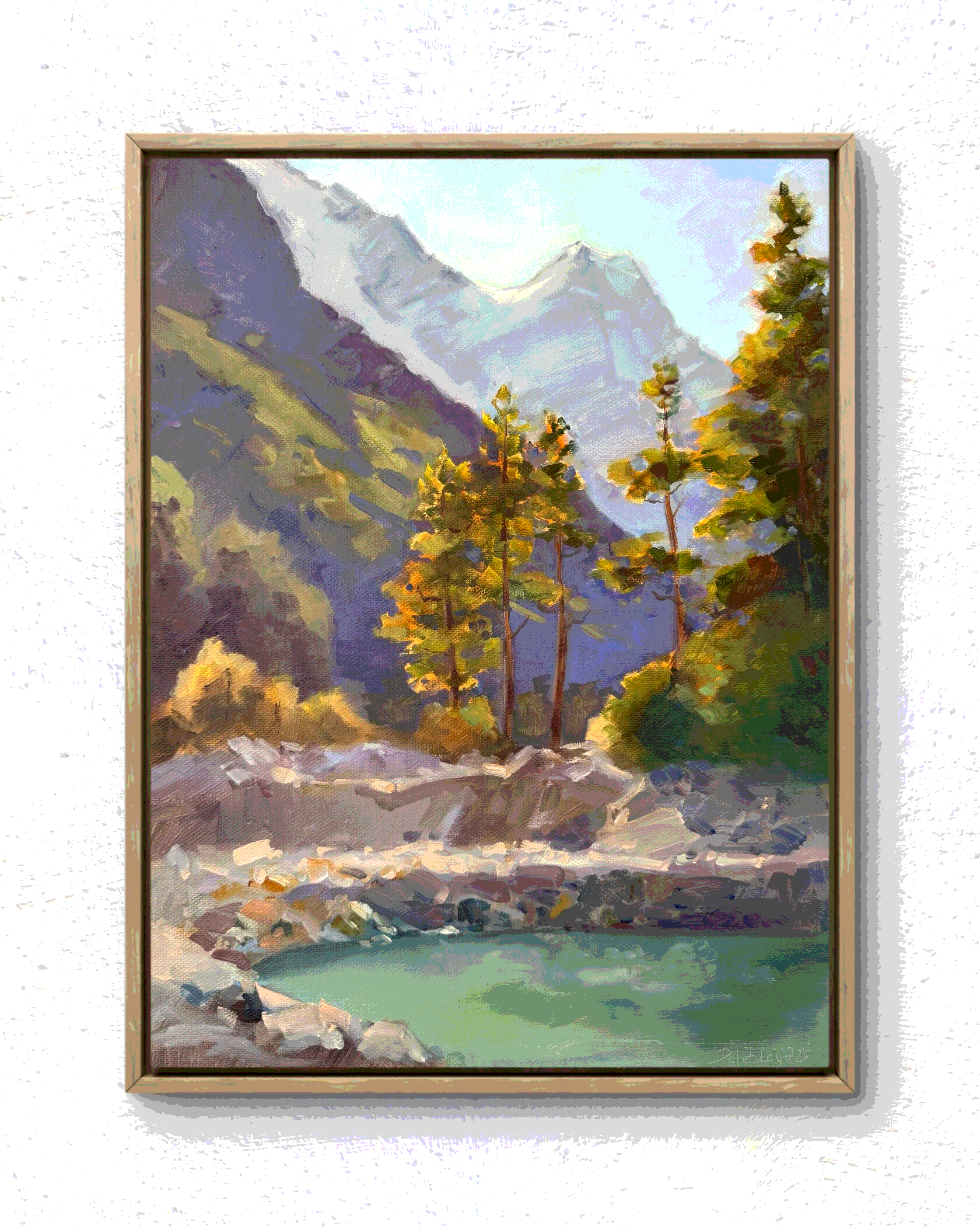Масляный пейзаж в мягких тонах, снежные горы с теплым подтоном. Картина доступна к приобретению, рама L-canvas из натурального дерева (белый цвет) прилагается