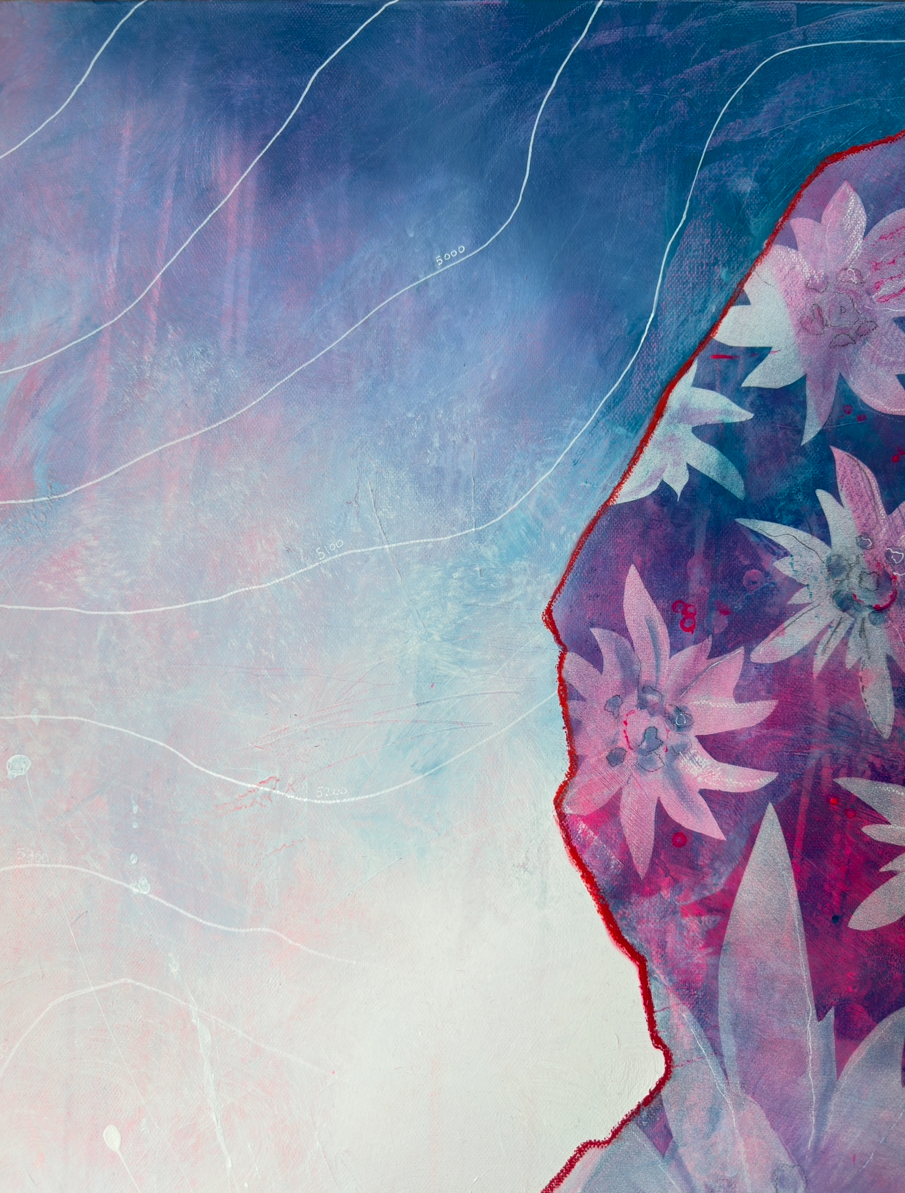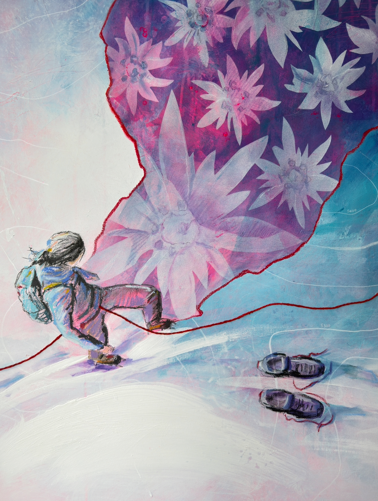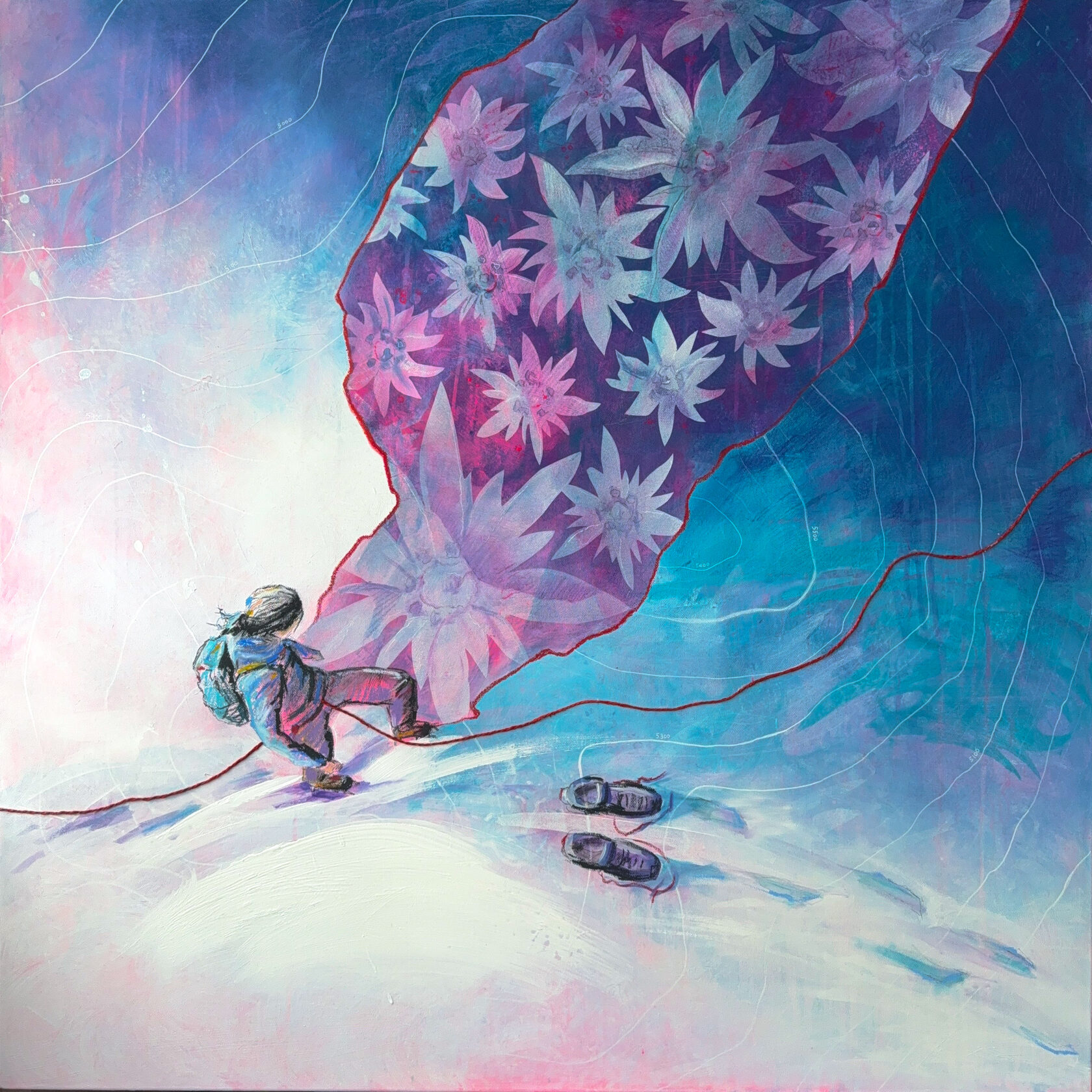 Образ женщины в связке, которая делает выбор - остановиться на достигнутом или идти дальше в Большие горы. Топографическая карта Эльбруса как символ ее серьезного шага в Альпинизме. В то время как тель из Эдельвейсов отражает ее внутренний мир и состояние. Это не про путь к вершине, а про момент осознанного выбора.